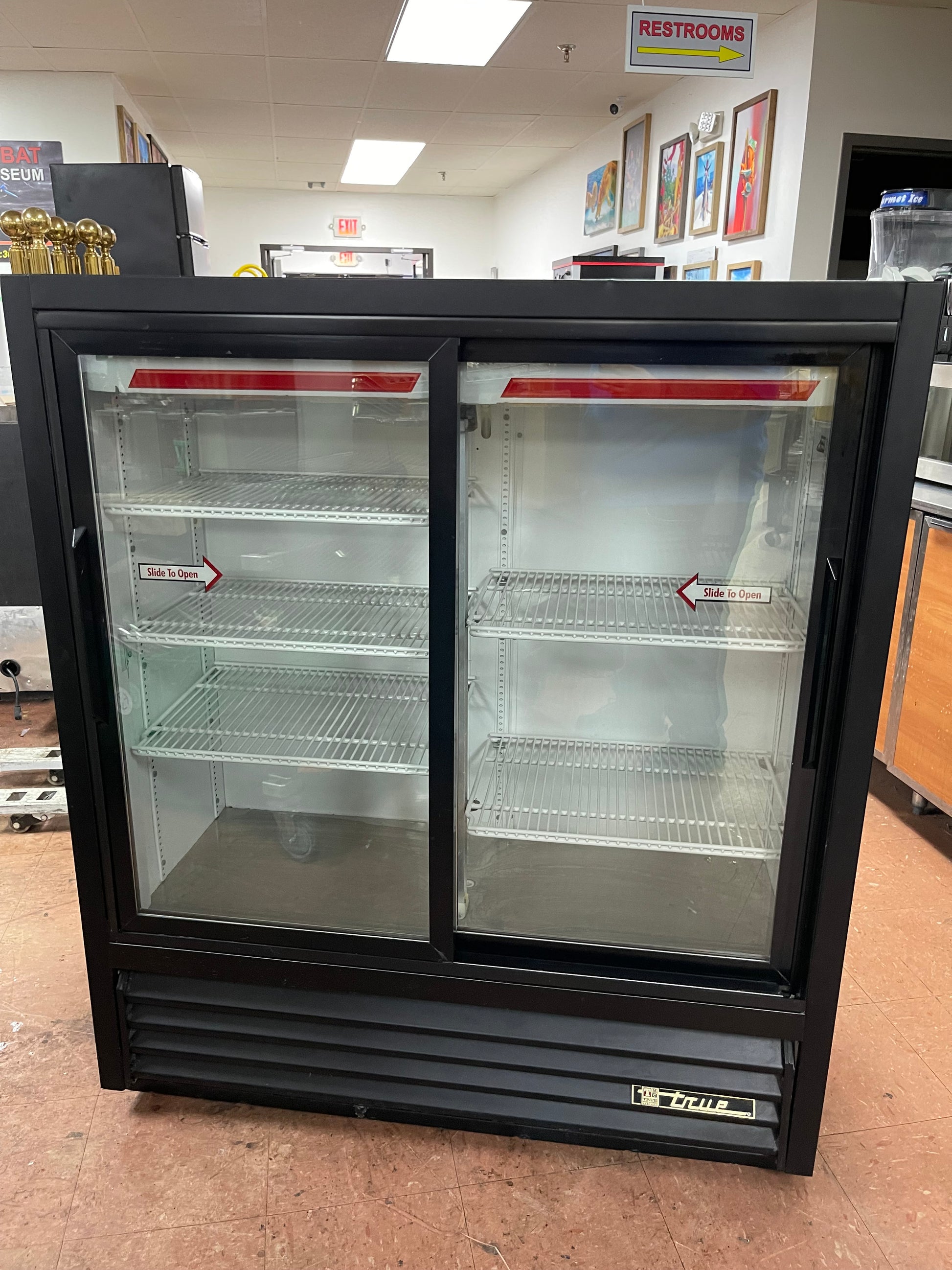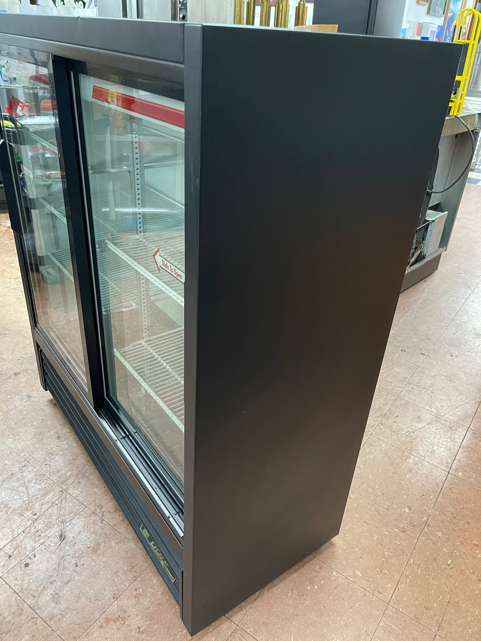 Attractively display merchandise and encourage impulse sales of drinks, salads, sandwiches, and other to-go items with the True merchandiser refrigerator! The sliding glass door design is great for narrow areas because it won't block any aisles when opened.