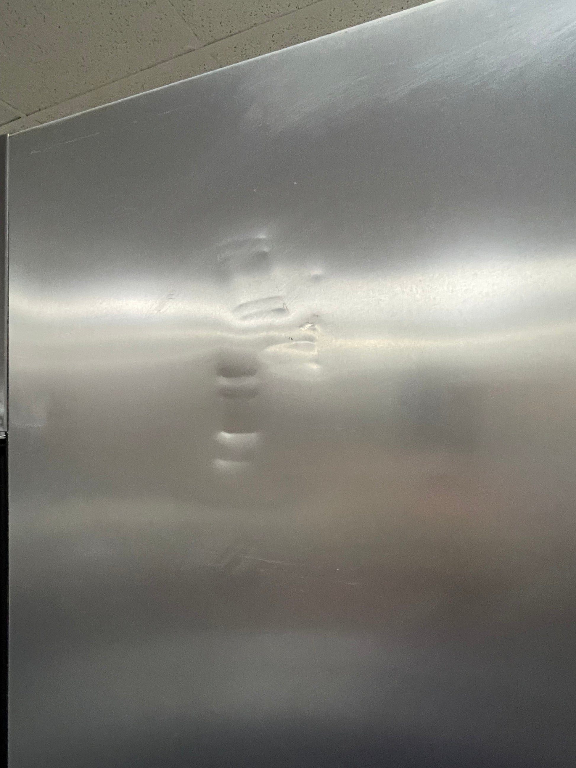 This refrigerator is used but has been cleaned and tested. There are some scuffs and scratches from use.