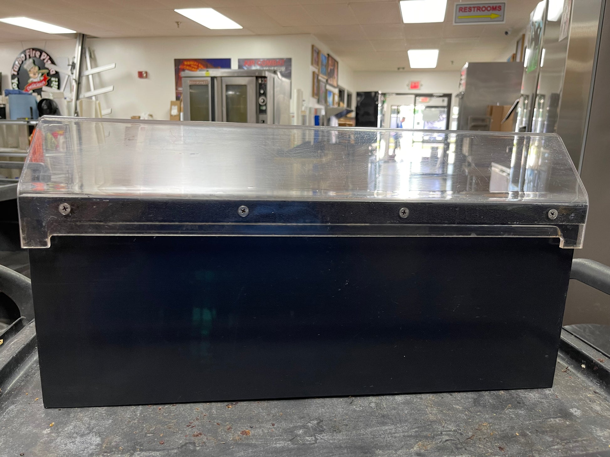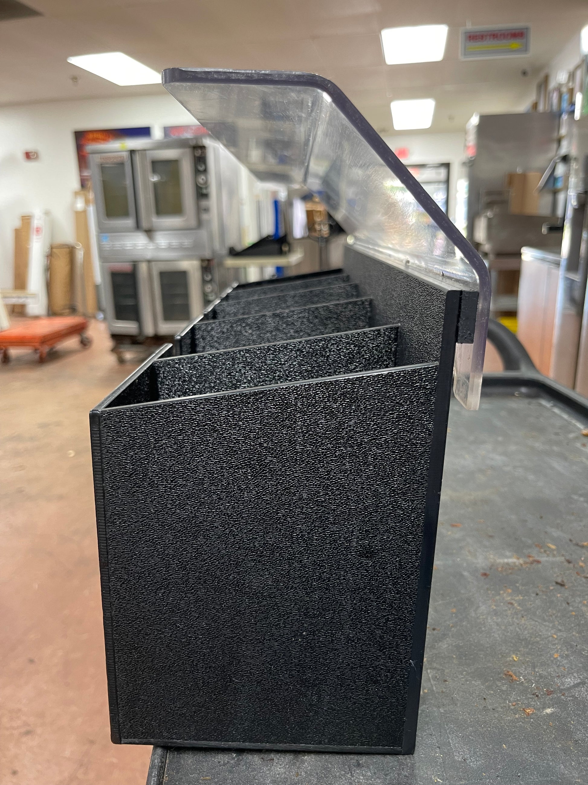 This lid organizer is used but has been cleaned and inspected. There are some scuffs and scratches on it from use. The dimensions are 21"xc5.5"x11".