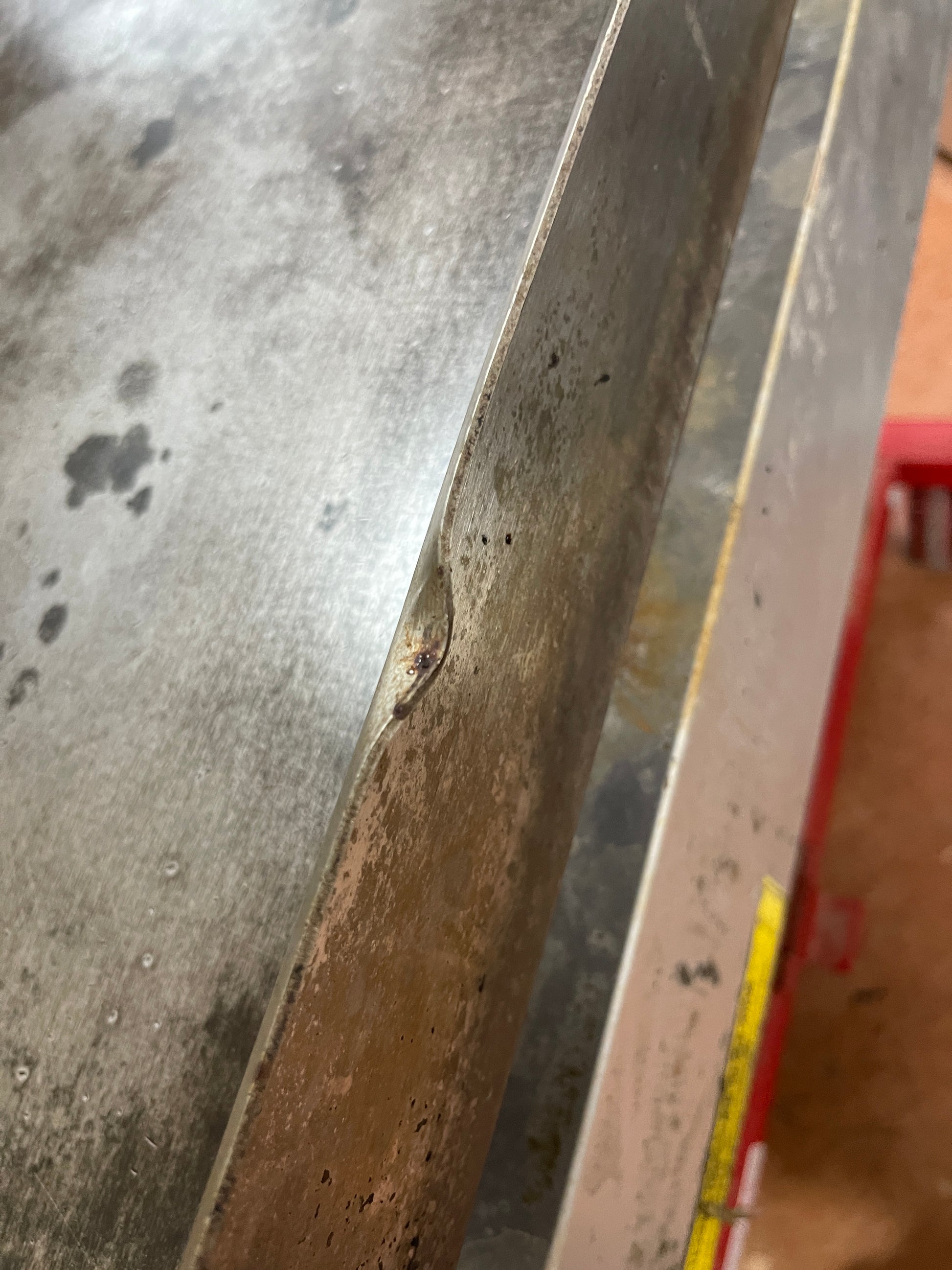 This griddle is used but is in good usable condition. There are some scuffs and scratches from use. The dimensions are 36"W x 26"D x 15.75"H.