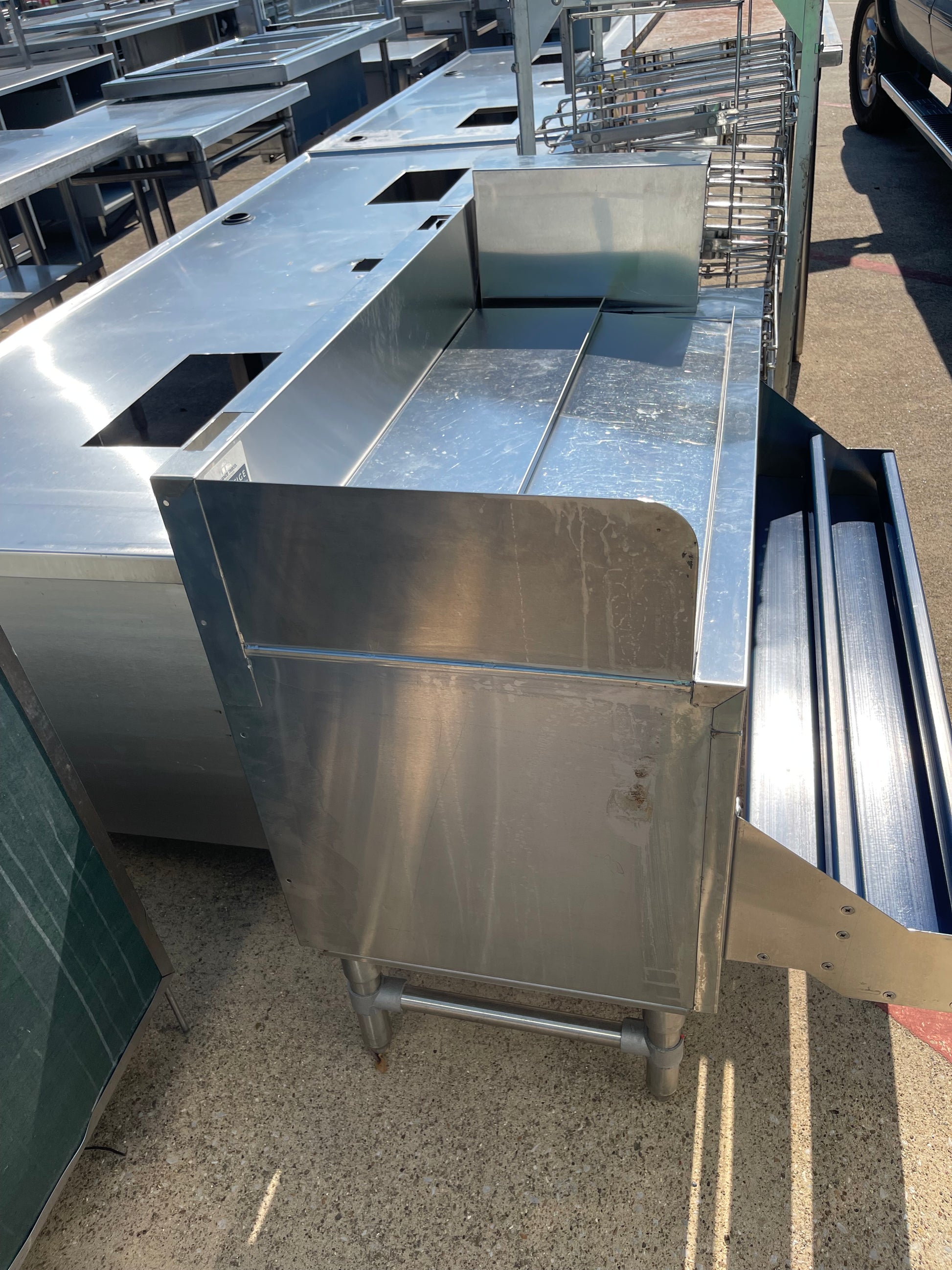 This ice bin is used but is in great usable condition. There are some scuffs and scratches from use. This is a very nice item with a lot of accessories. This would be a great addition to your business. This come with The PRSH-19-6 stainless soda gun holder and the PRDSR-42 20 bottle 2 tier speed rail.