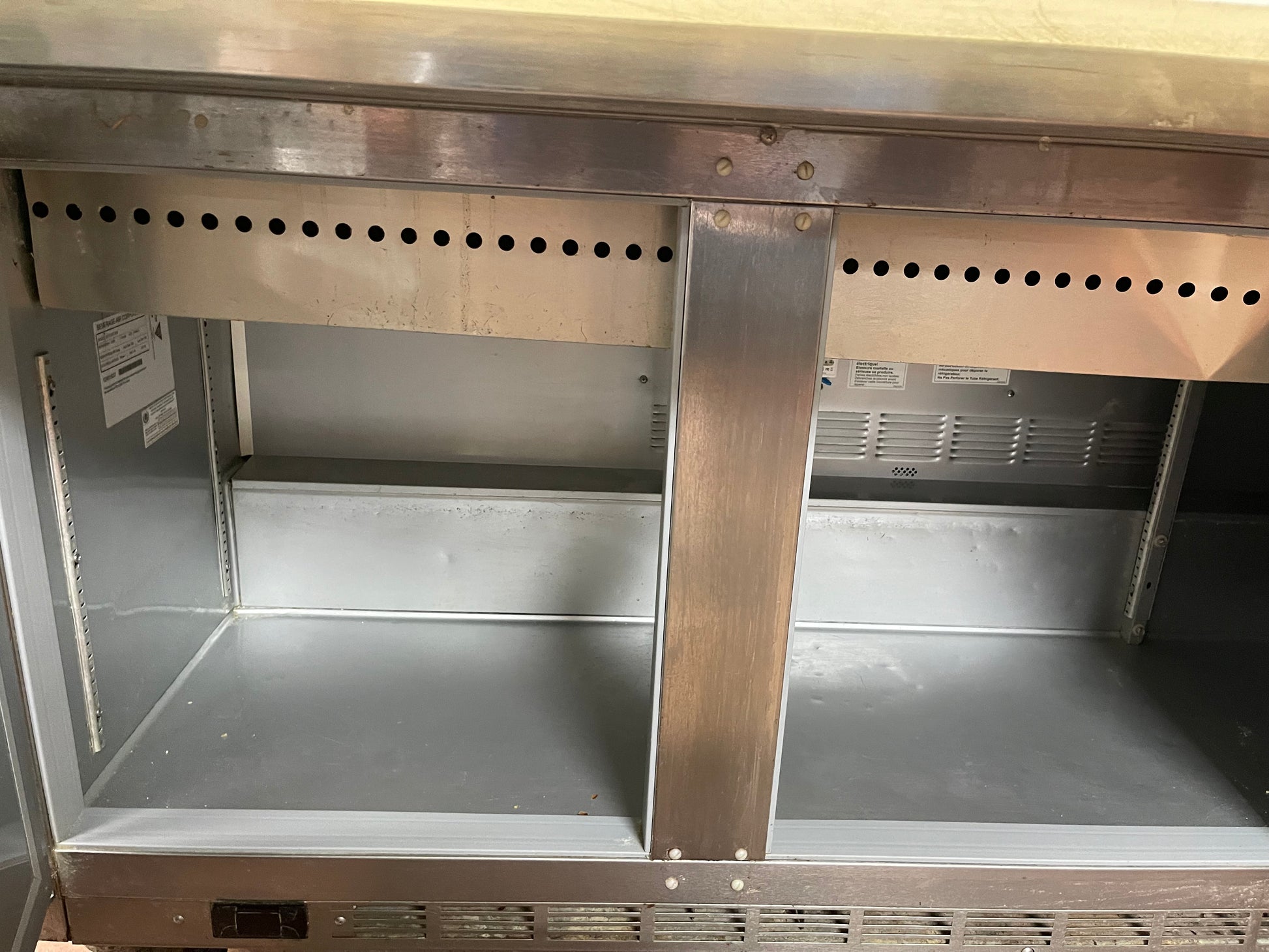 This prep table is used but has been cleaned and tested. There are some scuffs and scratches on it from use.