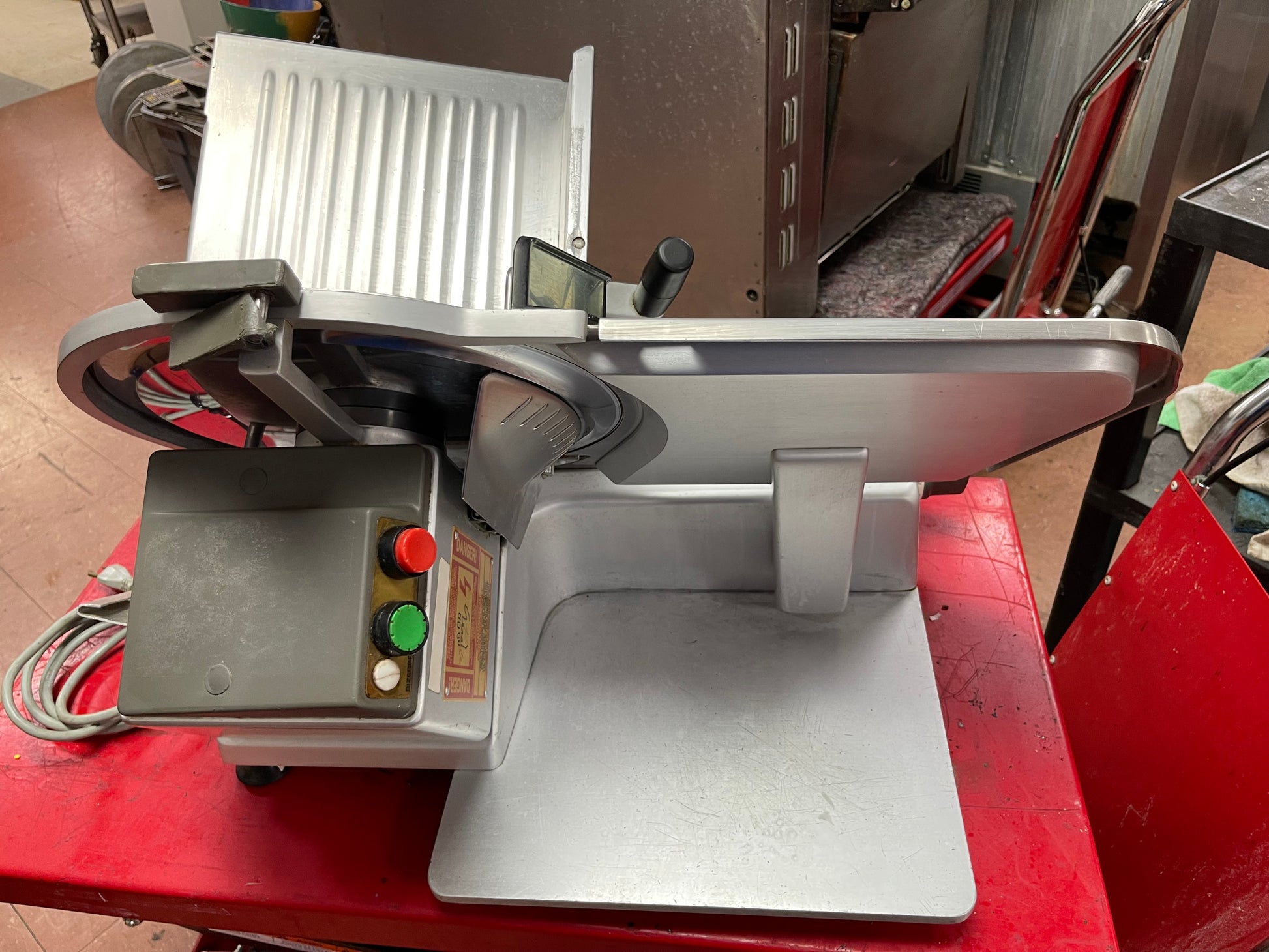 This meat slicer is used but has been cleaned and tested. There are some minor scuffs and scratches on it from use. Only what is pictured is included. This is a nice heavy duty 13" slicer.