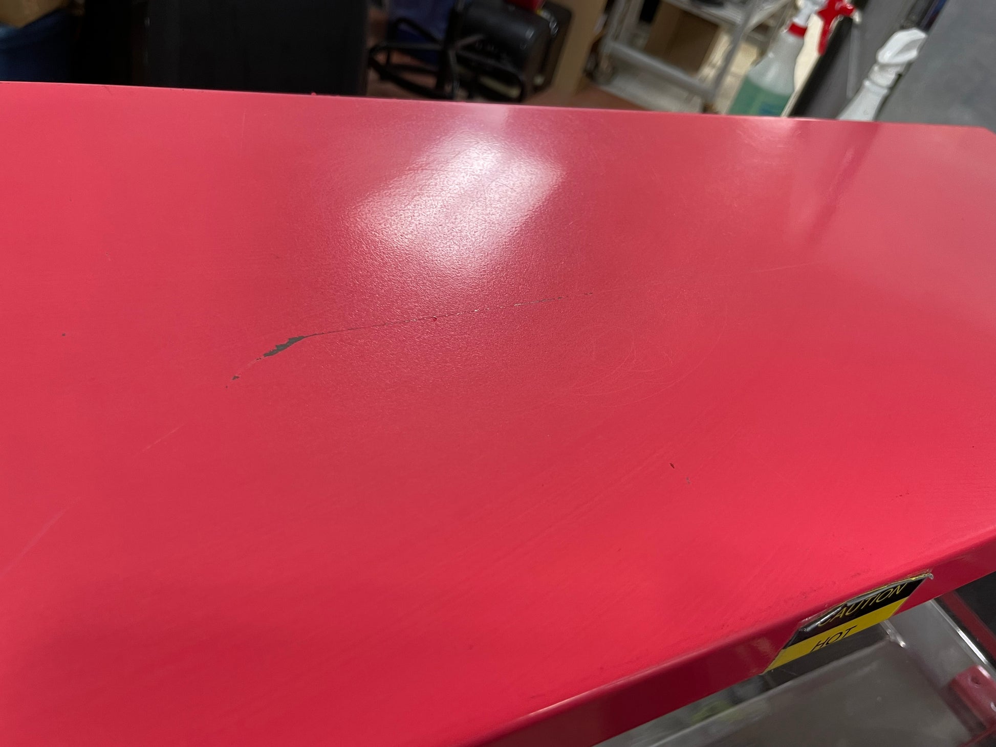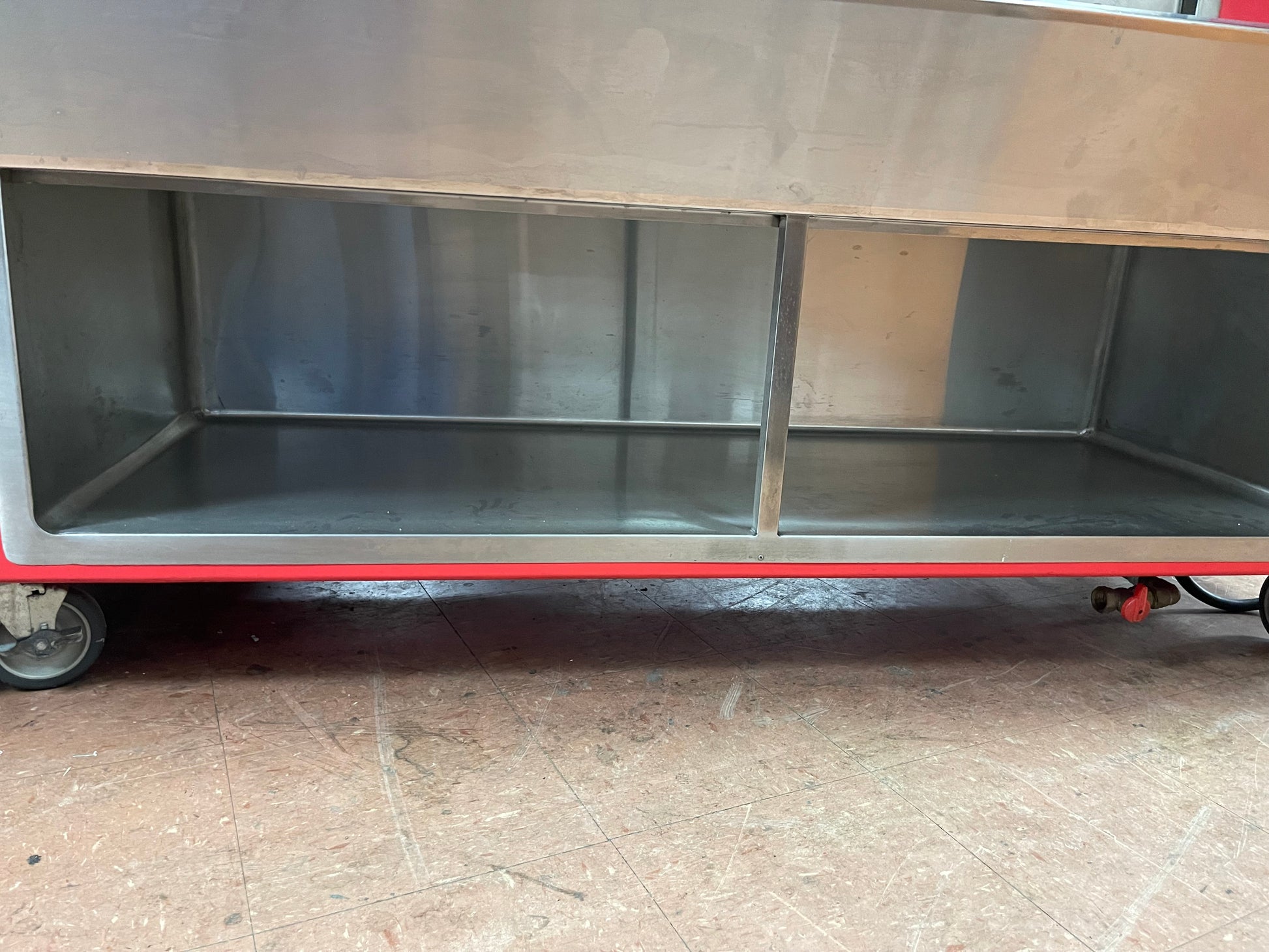 This steam table is used but has been tested. Everything works on this Table as it should. There are some minor scuffs and scratches on it from use (mainly on the very top). This is a very nice steam table with 4 heated compartments and two radiant heaters under the top for even heating. This would make a great addition to your business, There is a couple light bulbs burned out in the top but can easily be replaced. The dimensions are 74.5"x34"x50" without the shelf folded out. This it very easy to move around on its caster wheels.