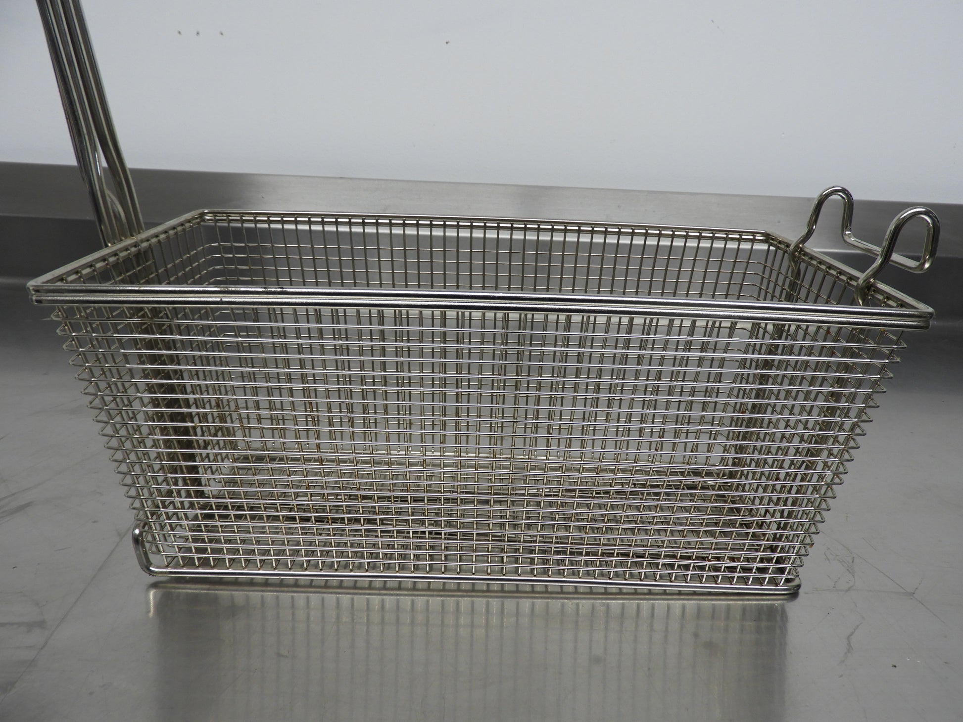 This fryer basket is used but in great usable condition. The dimensions are 14"x6.5"x5.5" with a 11" handle. This is a very well built heavy duty fryer basket for years of use. This would make a great addition to your business. We have several of these available so the one pictured may not be the one your receive. They are all in the same condition.