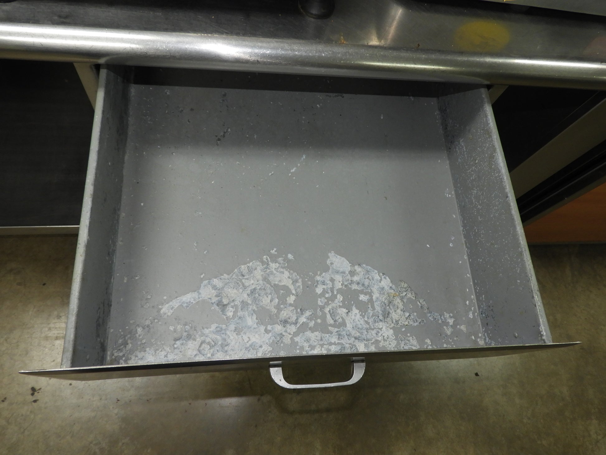 This table is used but in good usable condition. There are some scuffs and scratches on it from normal use. The dimensions are 84"x36"x33.5". This is a nice sturdy table with 2 drawers and an open storage compartment underneath.