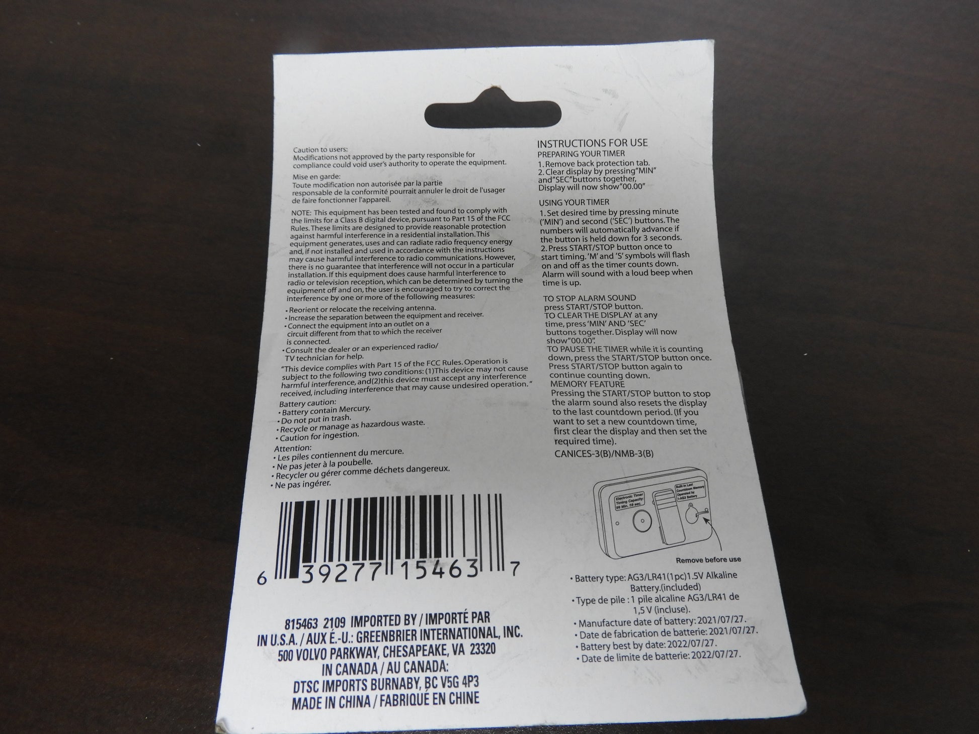 This is a new kitchen timer. Cooking Concepts model 815463 2109. We have several of these available so you may not get the color of timer in the picture. We have black, blue and red timers.