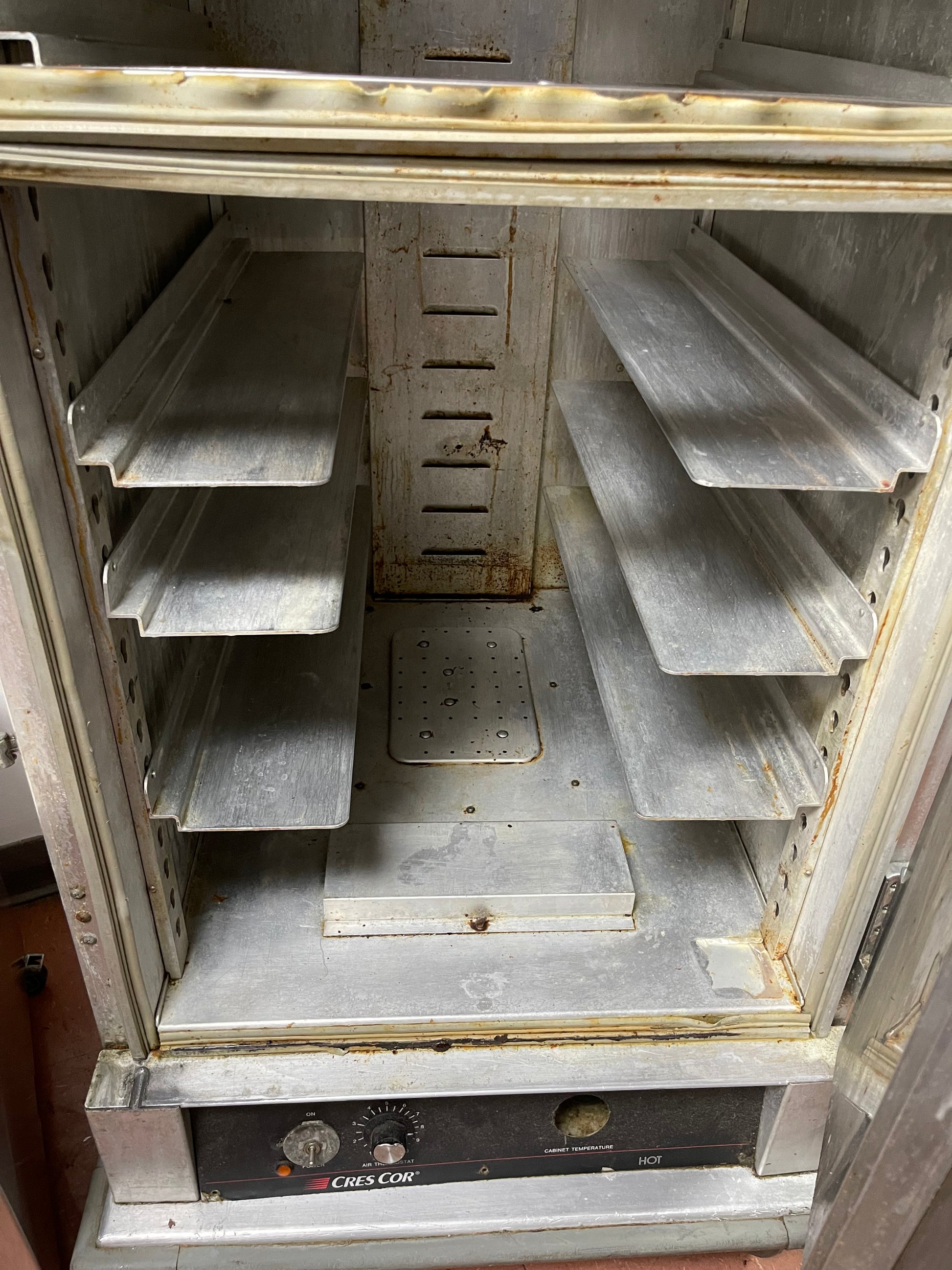 This Holding cabinet is used but has been cleaned and tested. There are some scuffs and scratches on it from use. This is missing the temp gauge at the bottom. Only what is pictured is included.