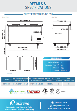 The Dukers BD/BG-520 commercial chest freezer has optimal storage capacity to store a variety of frozen foods. Solid open lid can better keep the low temperature. Using static cooling, each our chest freezer has a temperature range from 0 ~ -10°F with a fan assisted condenser.