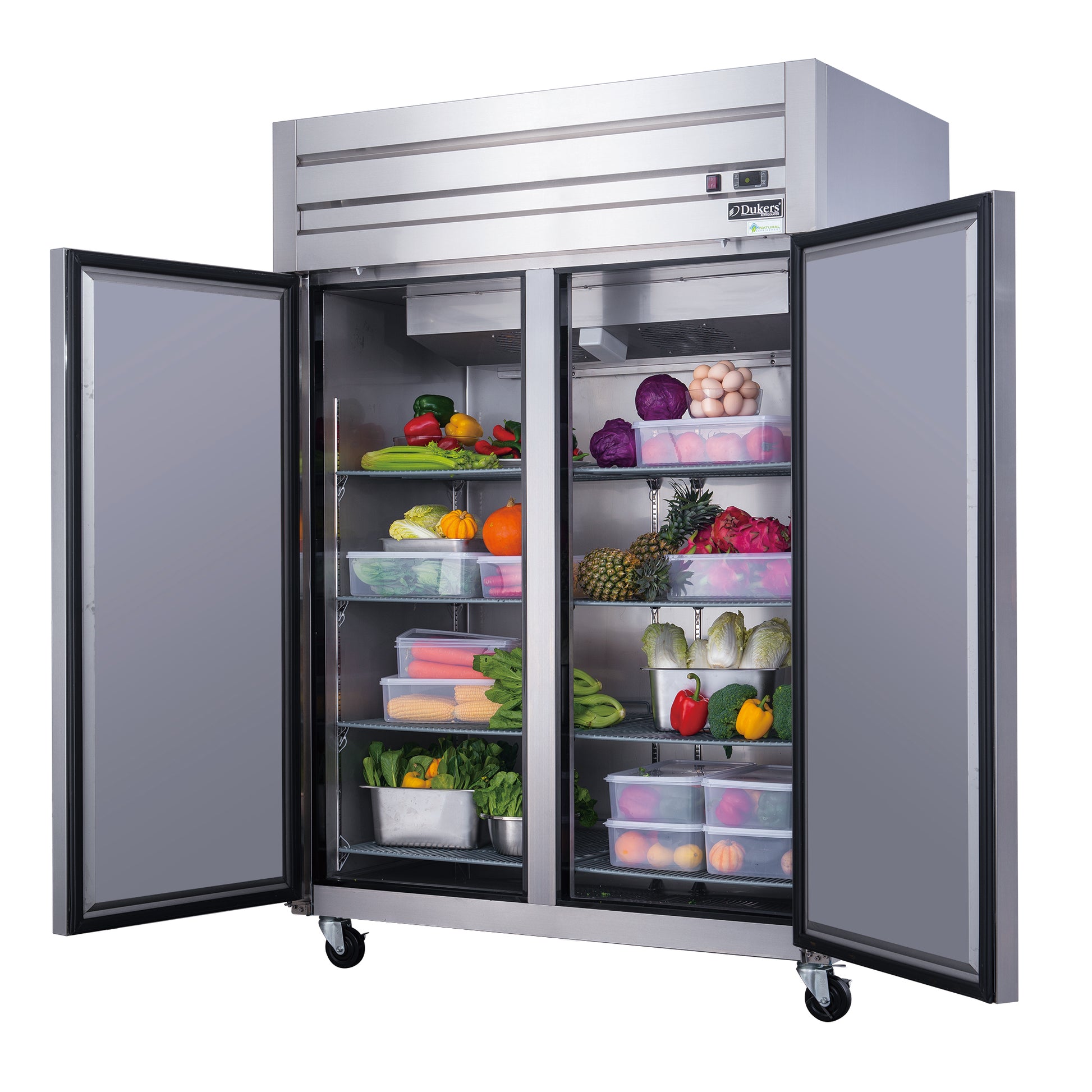 New Dukers D55AR Commercial Solid 2-Door Top Mount Refrigerator in Stainless Steel