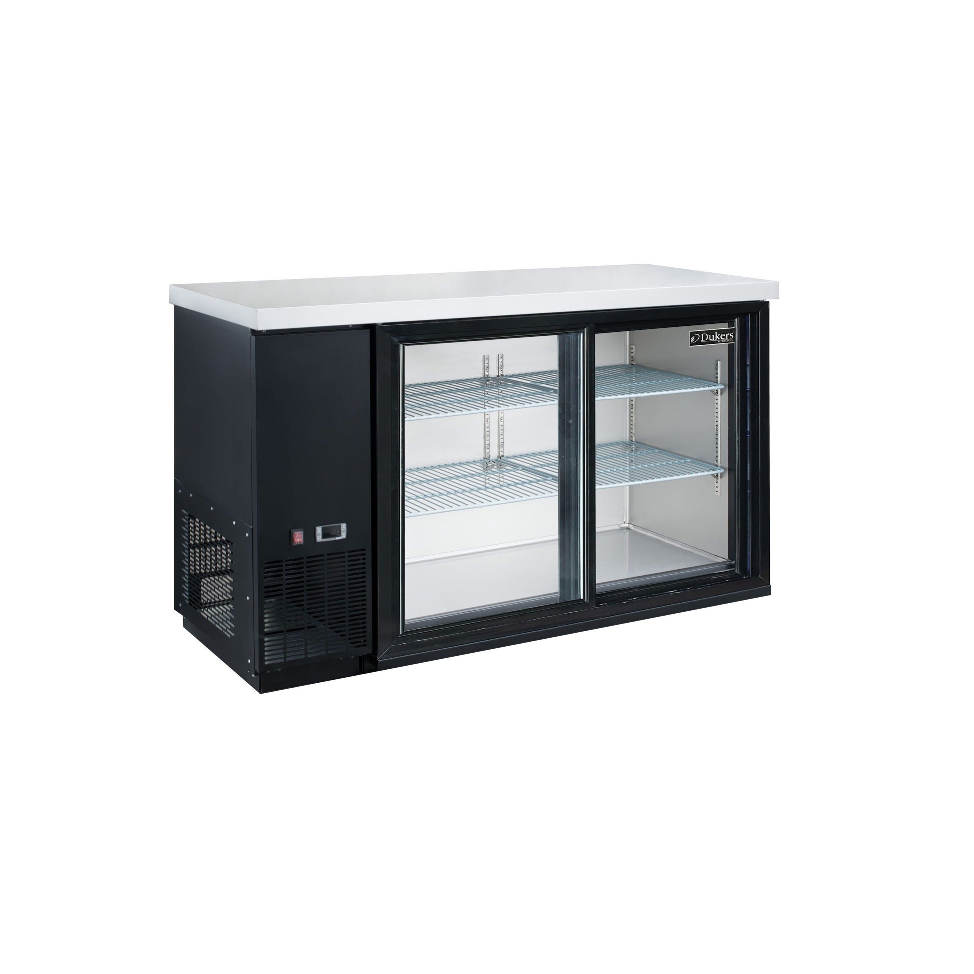 The Dukers DBB60-S2 under bar refrigerator is designed to chill and organize beer, soda, juice, and drink mixers in a convenient space-saving cabinet. Featured in a large 61 in. size and two doors, double pane tempered glass block UV light to safely keep all types of drinks ready to serve. Constructed of commercial-grade body panels in black textured finish to fit all decors and living spaces. Precision digital temperature controls allow pinpoint accuracy with temperatures from 33-38°F. Includes 4 adjustable and removable wire shelves. Uses sliding glass doors.