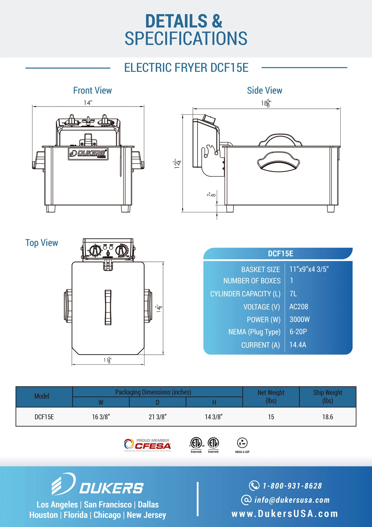 New Dukers - DCF15E, 15lb One Basket Electric Countertop Deep Fryer 208V