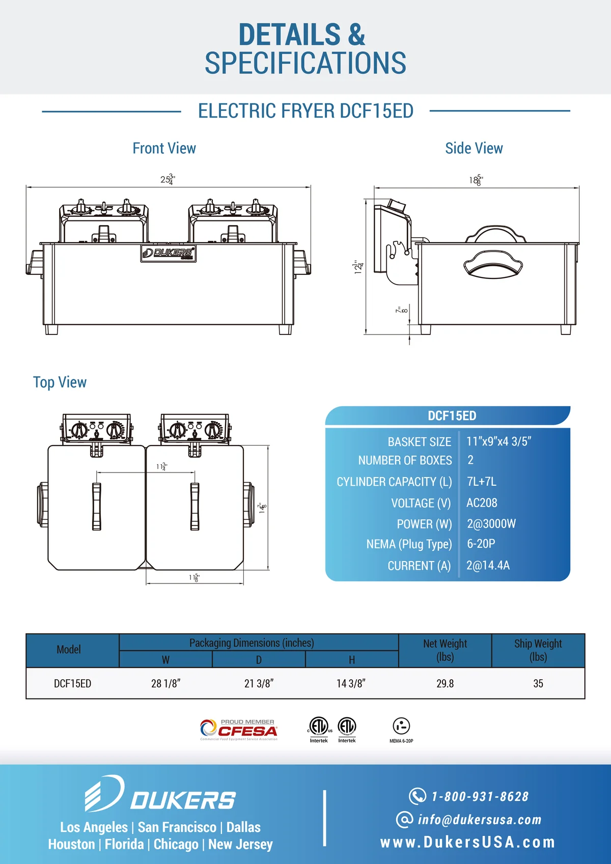 New Dukers - DCF15ED, 30lb - Two 15lb Baskets Electric Countertop Deep Fryer 208V