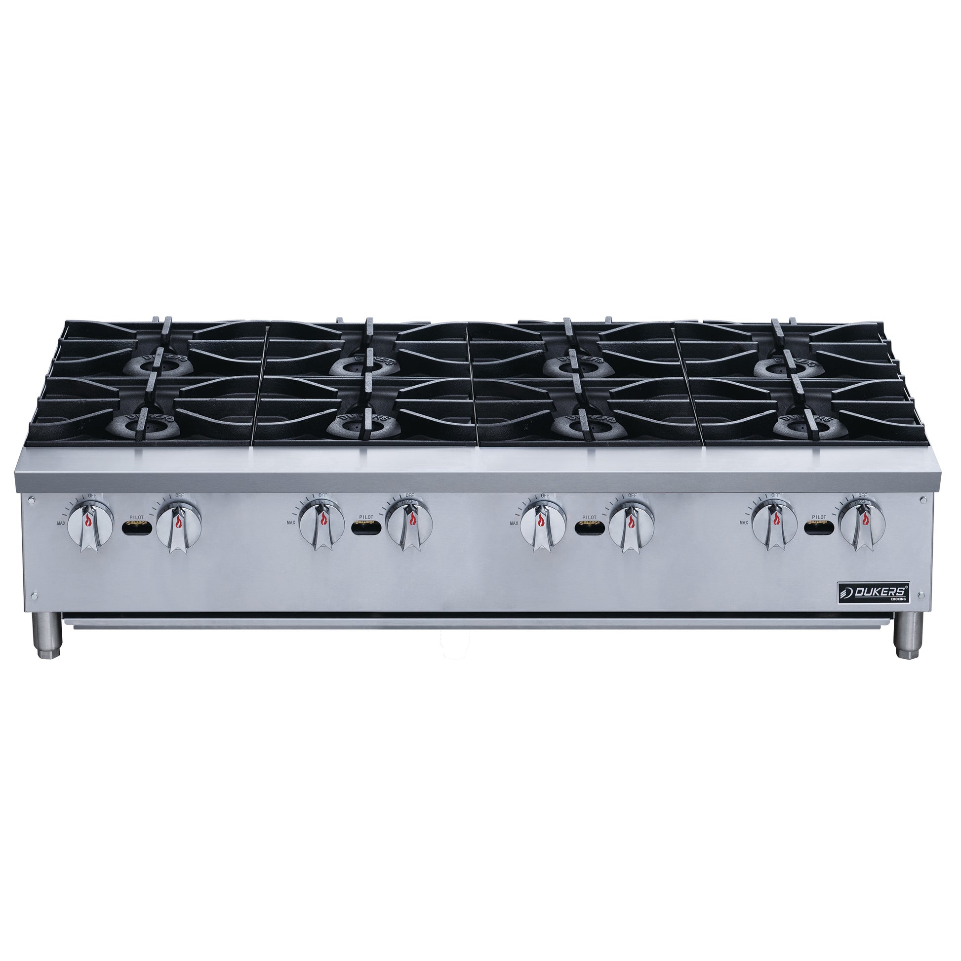 The Dukers DCHPA48 hot plate with 8 burners features 28,000 BTUs and works with natural gas or liquid propane.