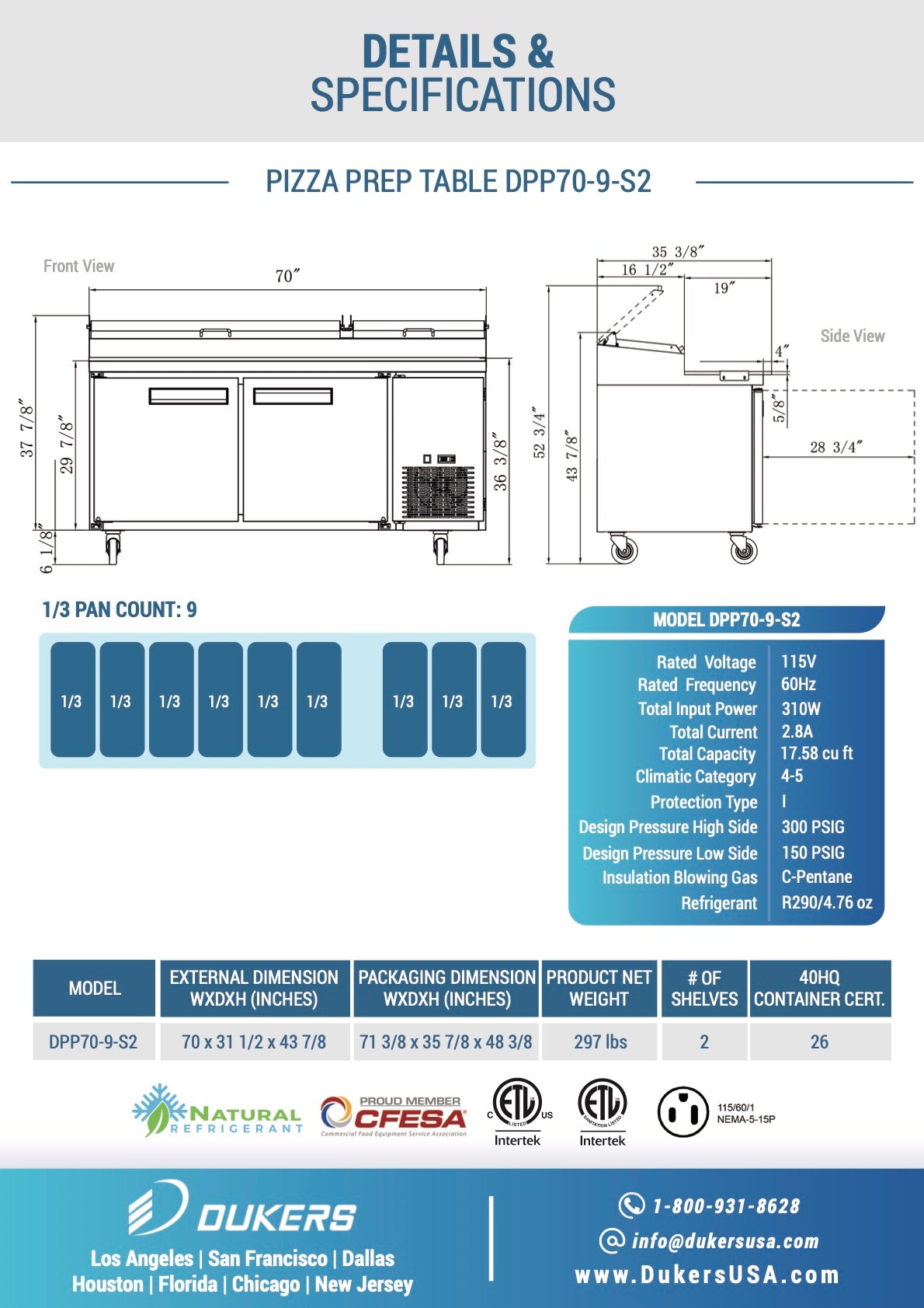 The Dukers DPP70-9-S2 commercial pizza prep table is constructed of heavy duty stainless steel to be durable and resilient to harsh kitchen environments. Keeps toppings and ingredients insulted with a hinged cover. Includes 9 1/3 pan containers to keep food organized and ready to use. The bottom conveniently holds additional items with 2 removable wire shelves that can be adjusted. With a range of 33°F to 41°F, it chills and safely stores all type of food. Digital temperature controls and LED display lets you precisely pick the desired temperature. Designed with a bottom mounted 1/4 HP compressor for efficiency.
