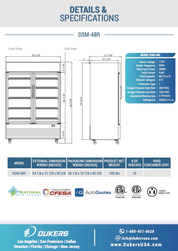 Designed perfectly to showcase and display any kind of merchandise, the Dukers DSM-48R double glass swing door merchandiser refrigerator chills products while offering a stylish enclosure for your business needs. Using super bright LED lighting and a backlit marquee, this unit keeps your merchandise brightly light and easily visible from any location. With a range of 33°F to 41°F, it chills and safely stores all type of food ice-cold. Digital temperature controls and LED display lets you precisely pick the desired temperature. Designed with a bottom mounted 3/5 HP compressor for efficiency. Includes 10 adjustable and removable wire shelves to suit merchandise of any size.