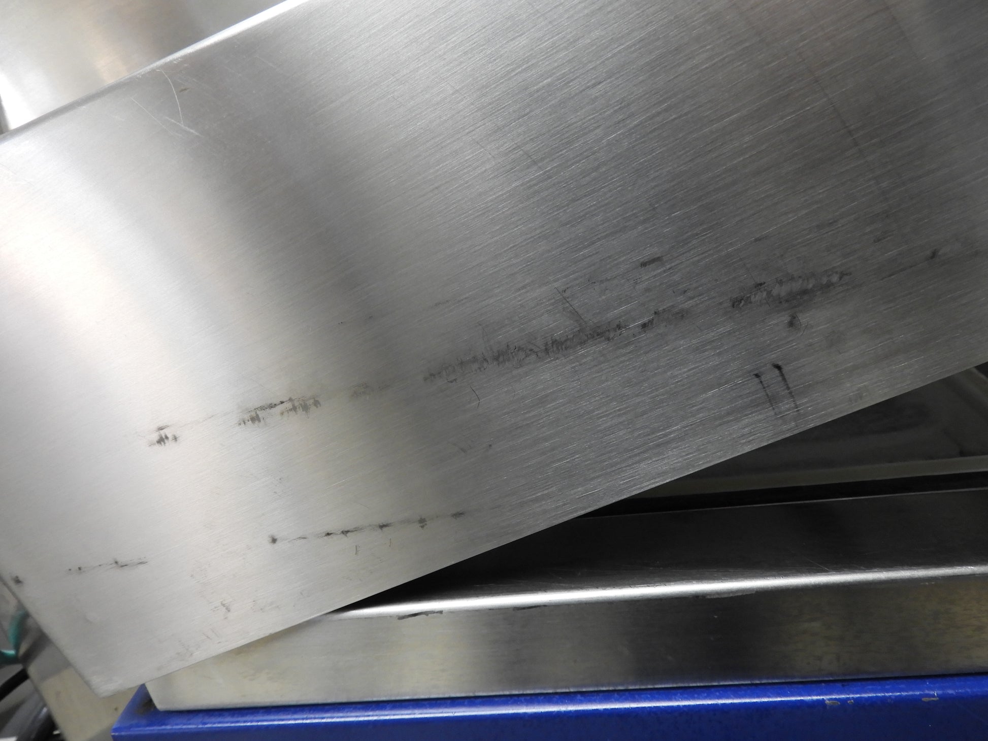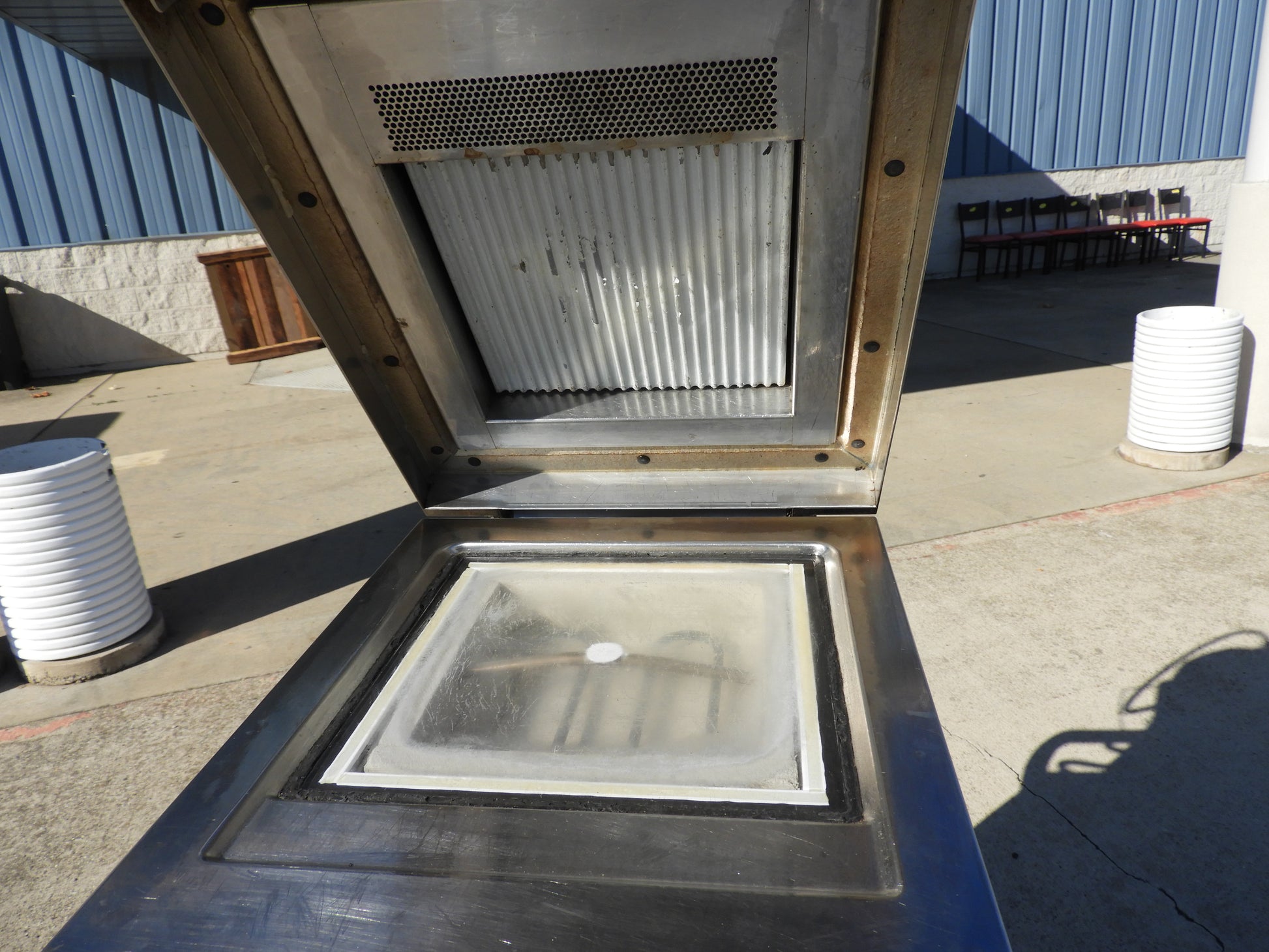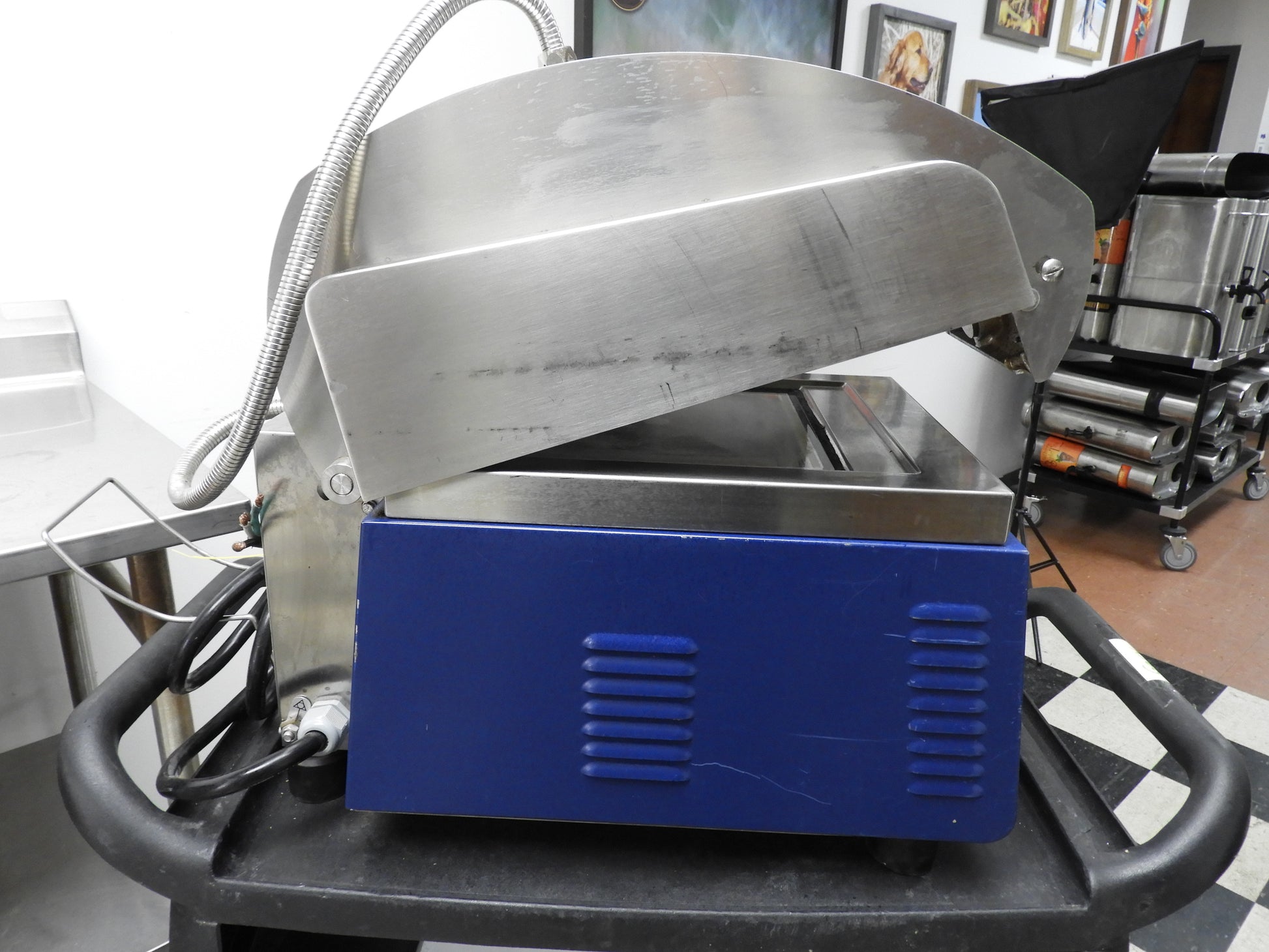 This panini press is used but has been cleaned and tested. Everything works as it should, There are some scuffs and scratches on it from normal used. This is a very heavy duty press and would be a great addition to your business. It has a self releasing lid when food is done and can be programmed for different plate temps and cooking times. The top plate does have some of the non stick coating coming off. This press has a smooth bottom plate and a ridged top plate for great lines on your panini. The dimensions are 30"x23"x16". This is a heavy and well built item.