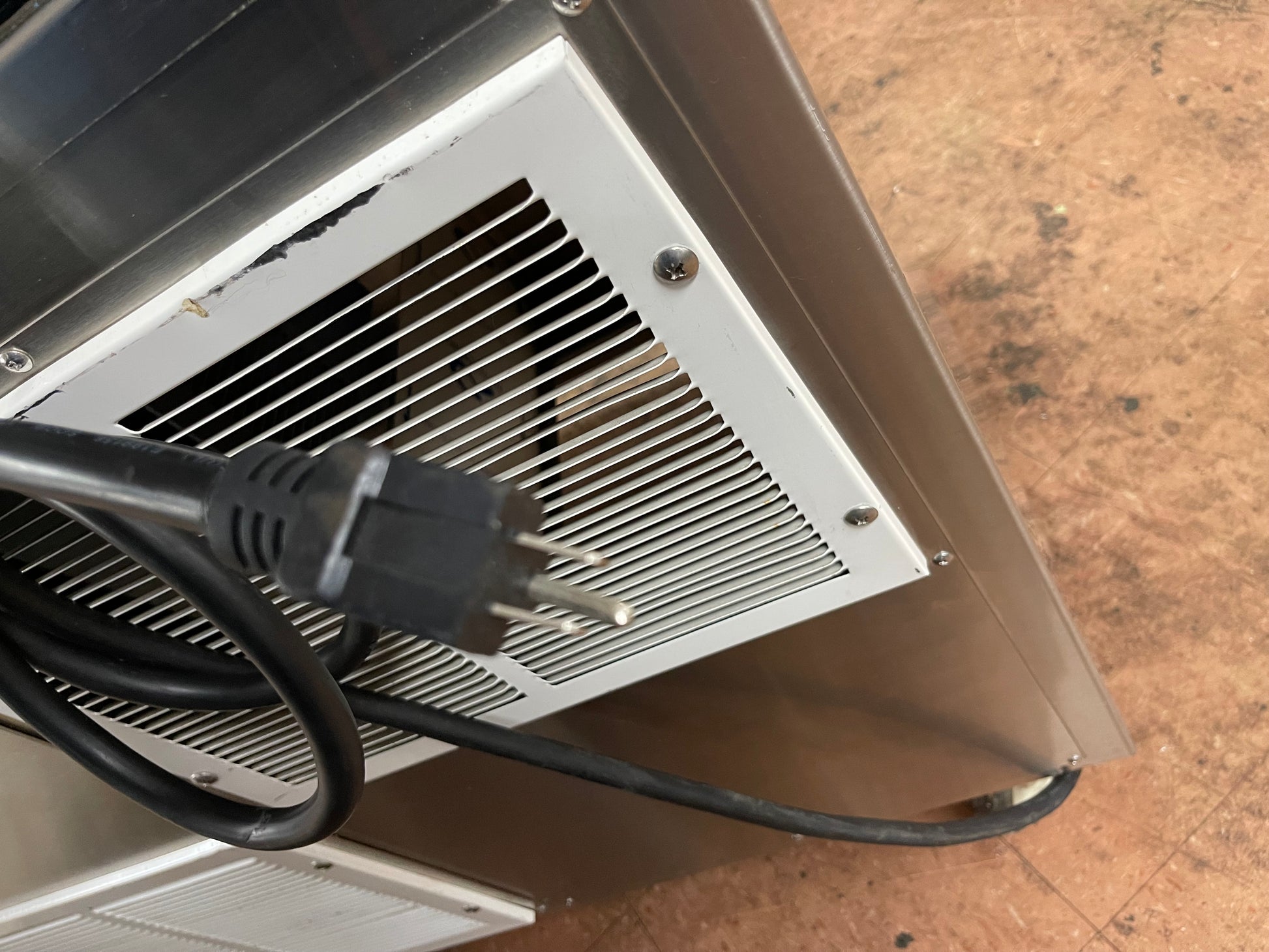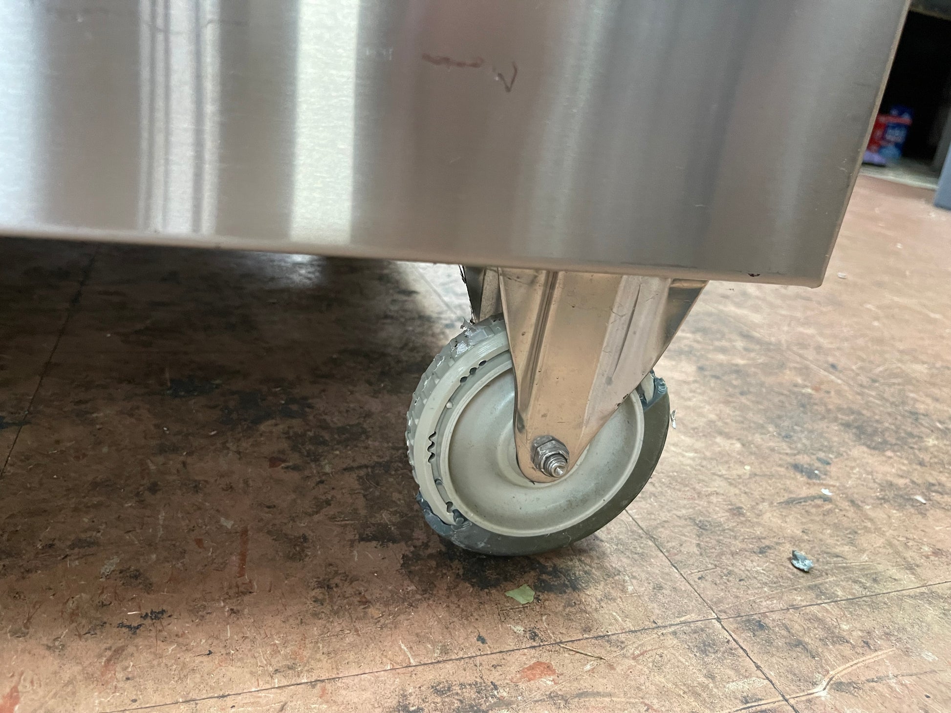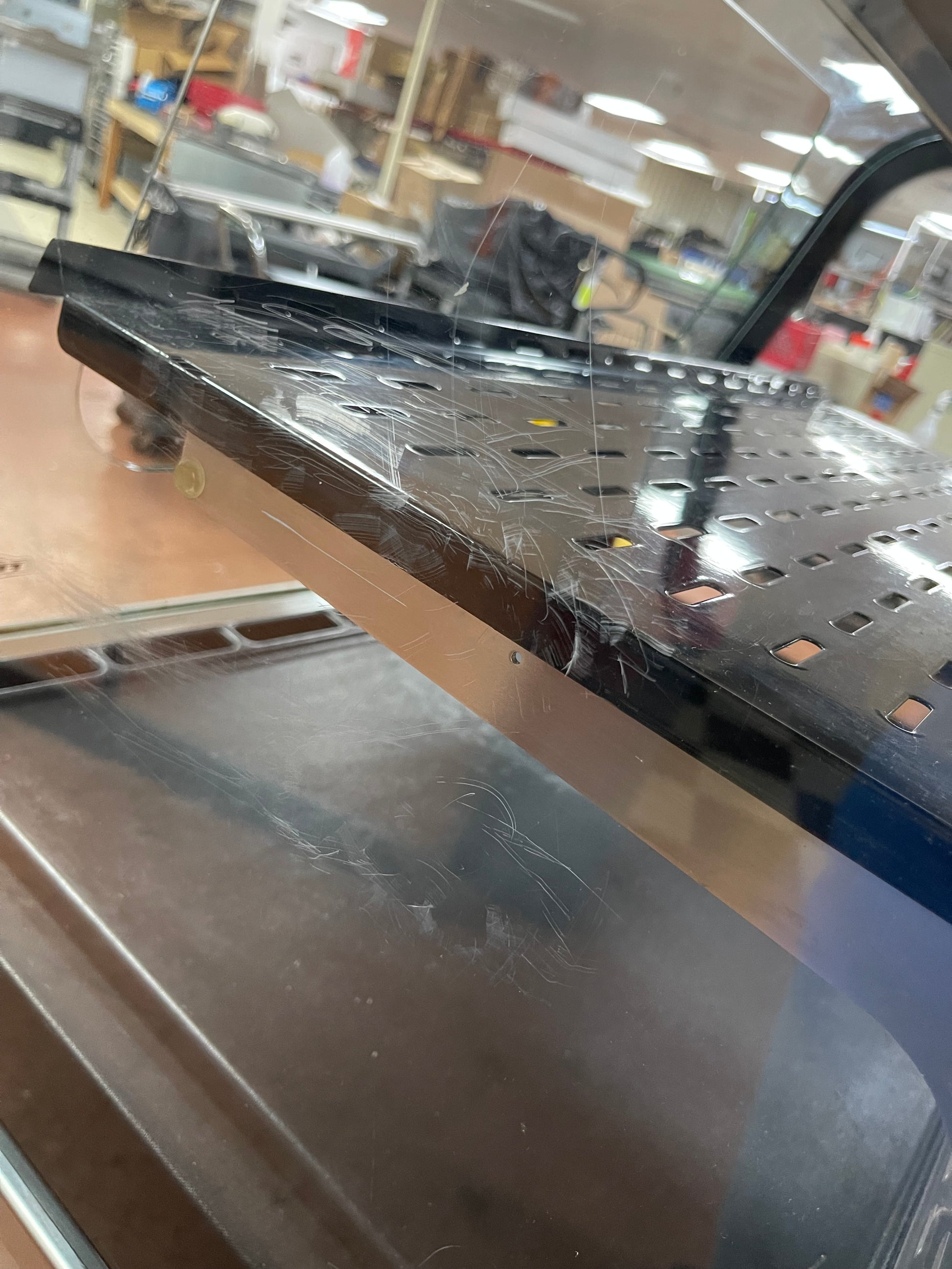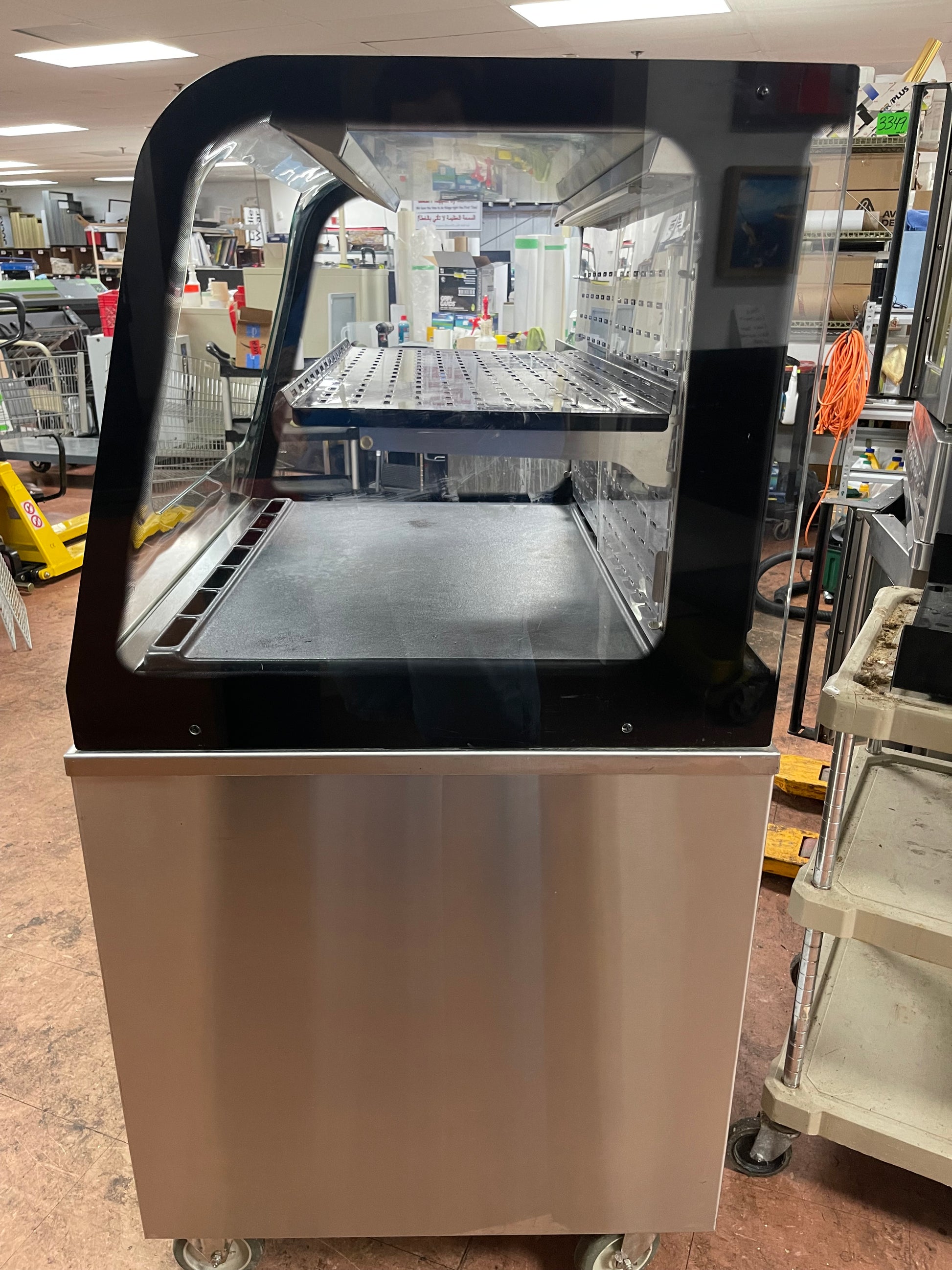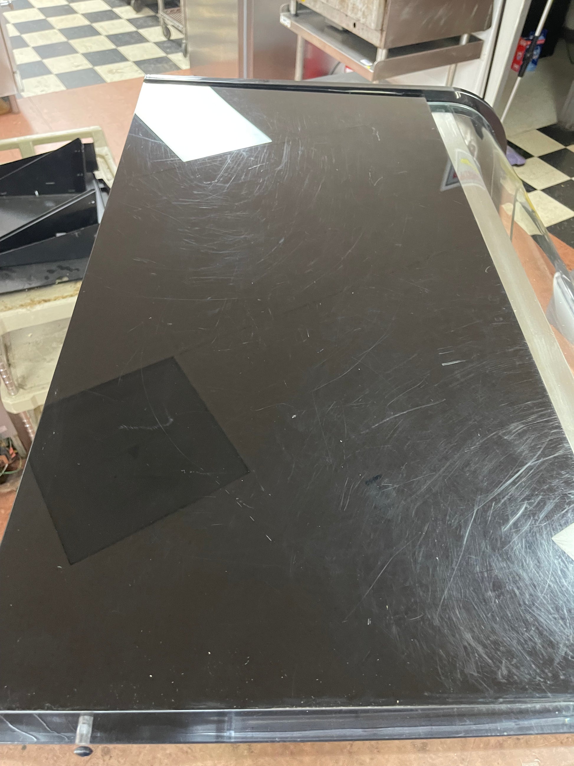 This refrigerated display is used but has been cleaned and tested. There are some scuffs and scratches on it from use. There are some scratches on the right side glass (see pictures), also one the rubber is coming off of one of the wheels but it still moves around very easy. The weight is 408lbs.