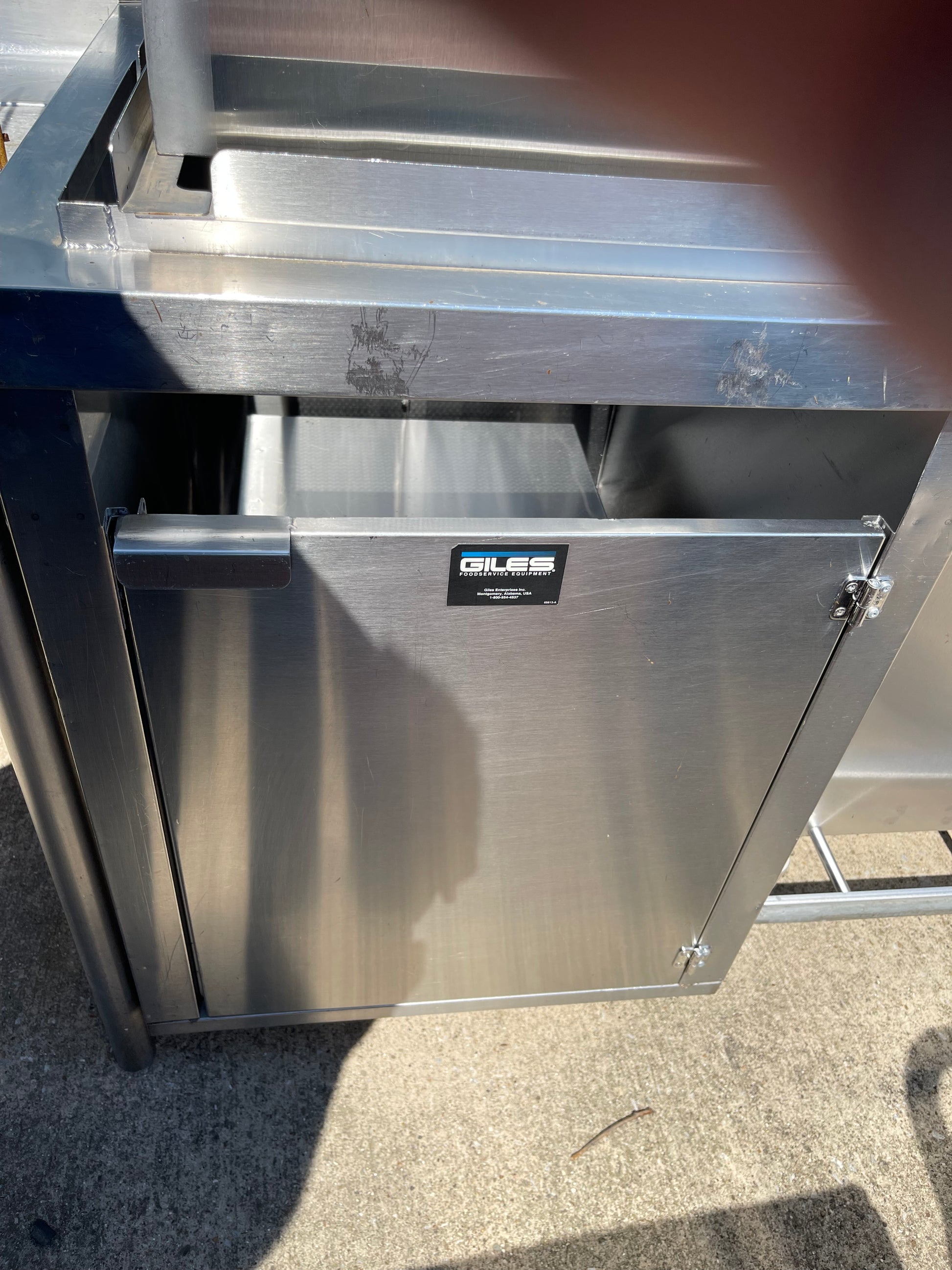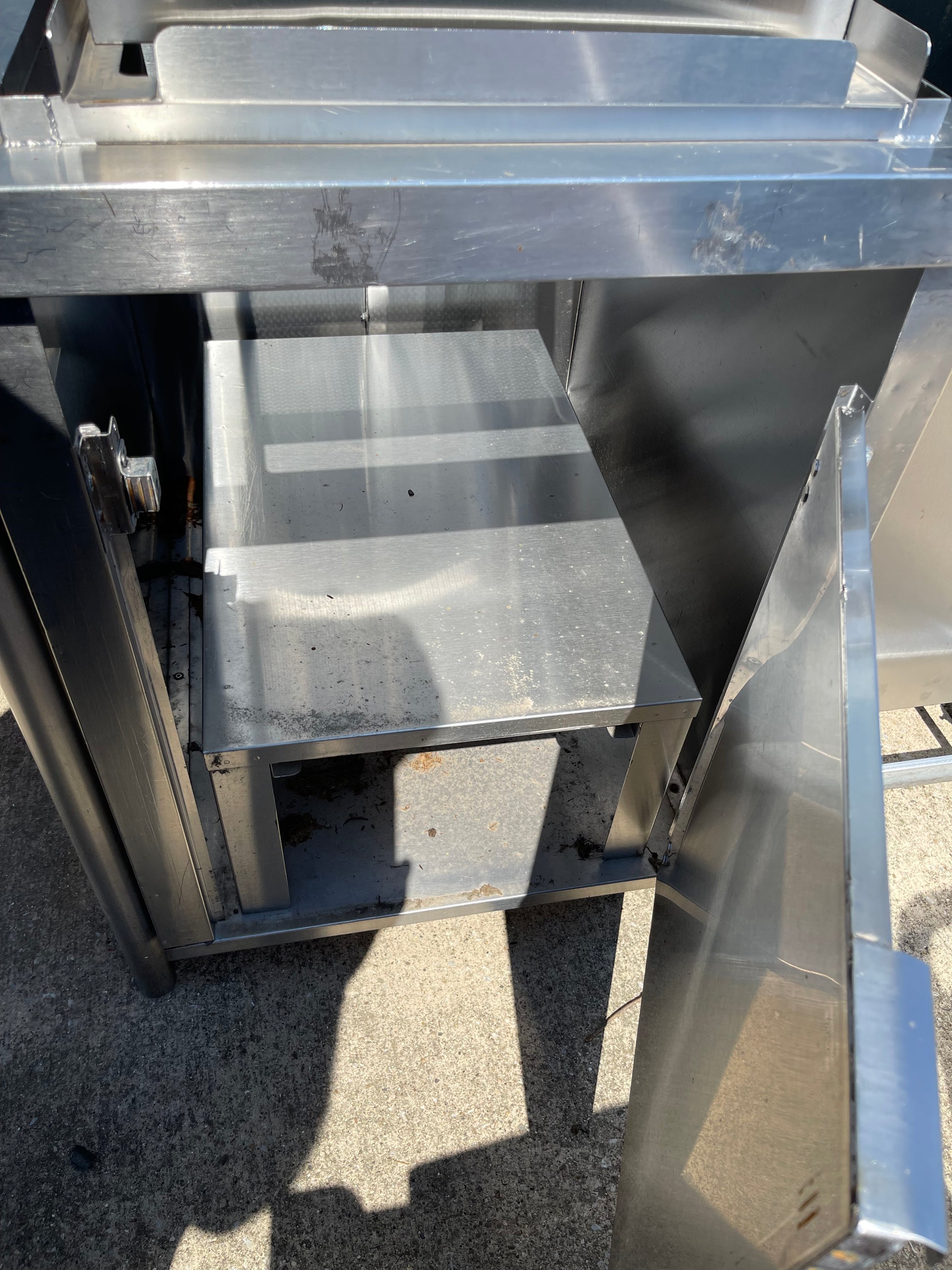 This breading station is used but is in good condition. There are some scuffs and scratches on it from use. There may be some parts missing from this item which is why it is priced lower than normal. This should still be of good use to someone. This moves around very easy on casters wheels and is in really good condition. The dimensions are 24.25"W x 30"D x 54"H.