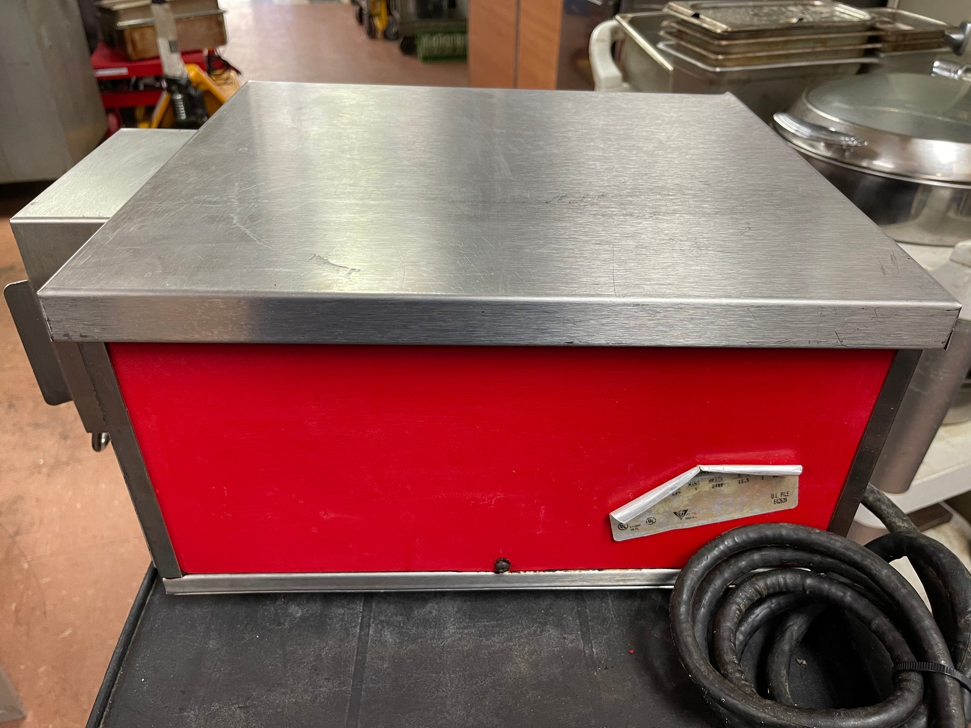 This food finisher is used but has been cleaned and tested. There are some scuffs and scratches on it from use. This has 2 upper elements, infrared ribbon element, microprocessor controls, includes food paddle, stainless steel interior. The dimensions are 20"x14"x0".