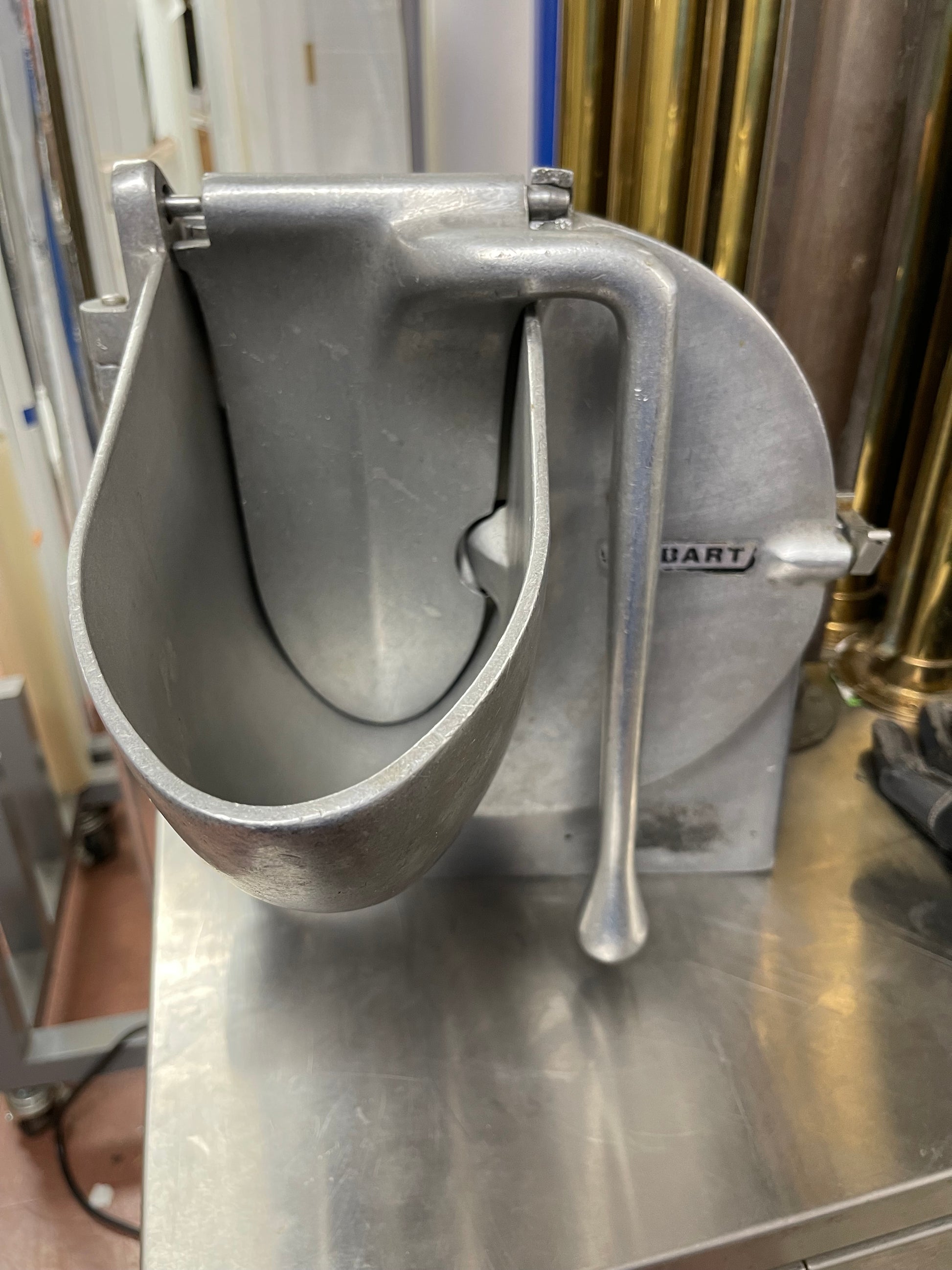 This attachment is used but in good working condition. There are some scuffs and scratches on it from normal use. This would be a great item to speed up your food prep. This is for the Hobart #12 hub. There is a piece broken off of the feeder door hinge (see pictures) but it still functions as it should. This also comes with 2 shredder plates.