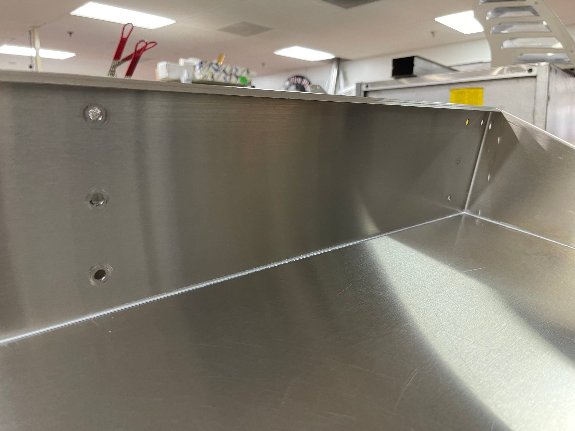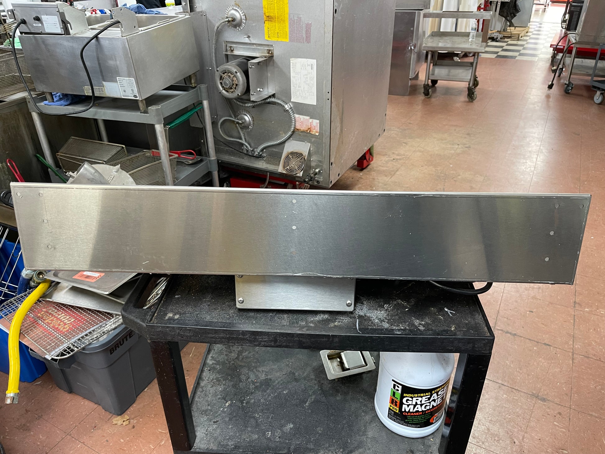 This shelf is used but has been cleaned and tested. There are some scuffs and scratches on it from normal use. This is a nice sturdy heated shelf. The dimensions are 36"x18"x9.5".