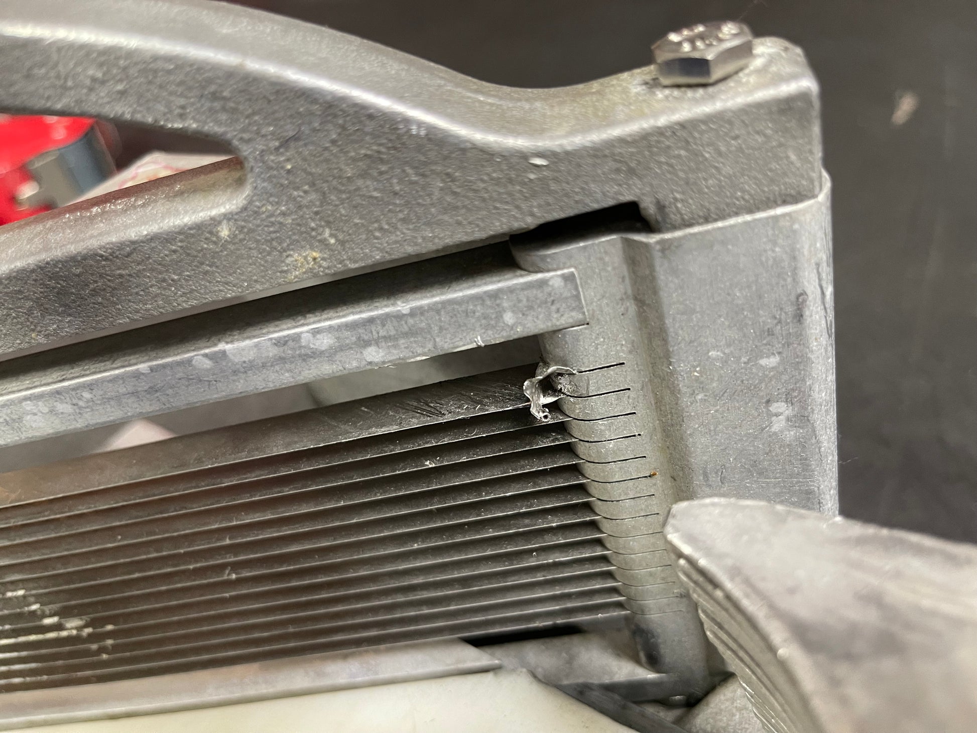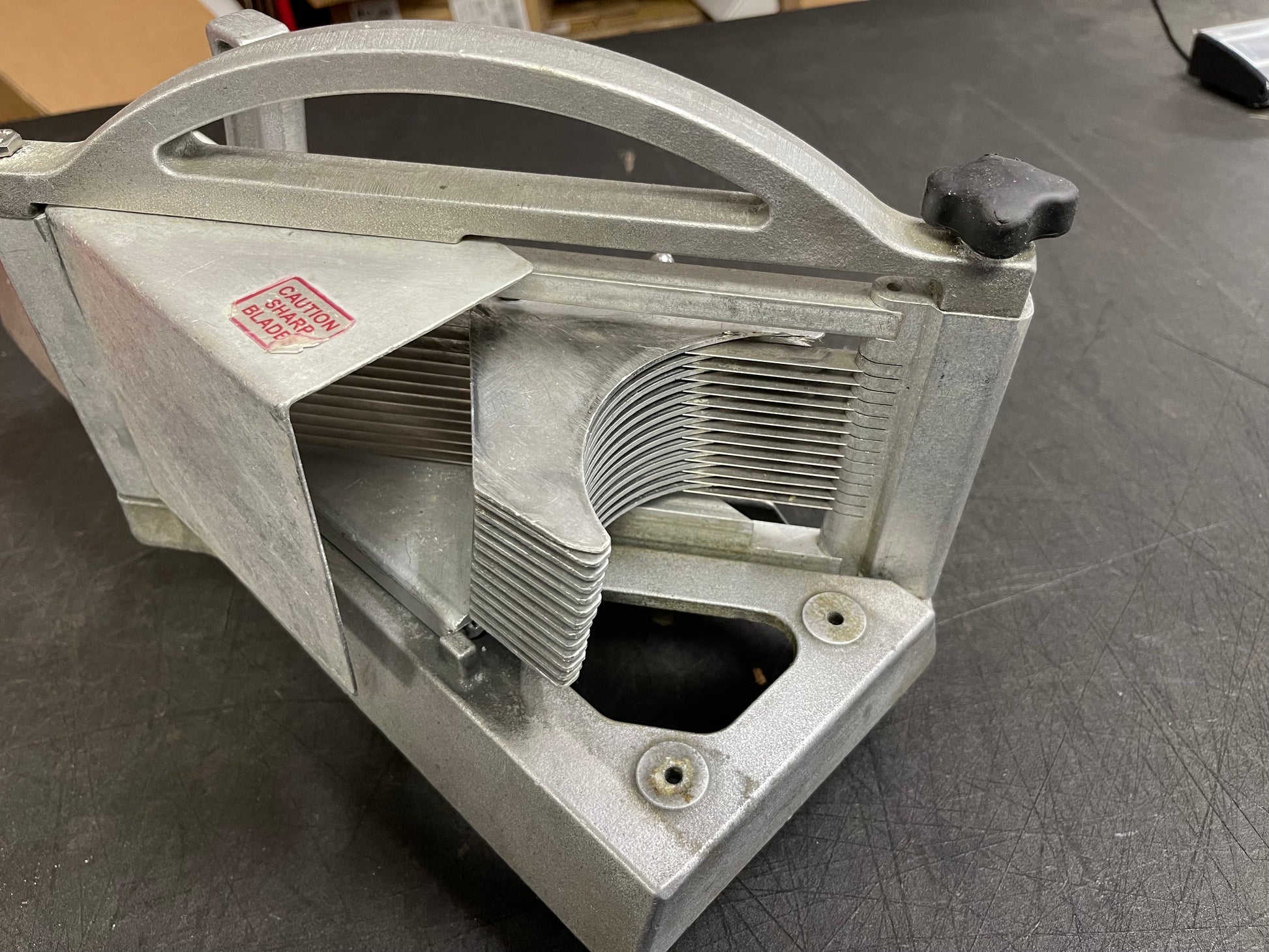 This slicer is used. It is missing the cutting board that catches the cut tomatoes. Also the very top blade is broken off and it is missing the stop on the back. This would be easy to fix up or just use as is.