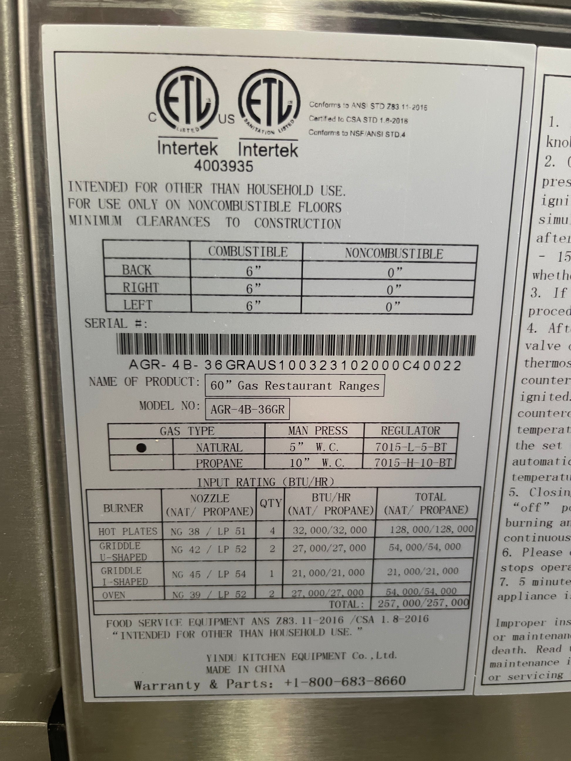 The Atosa AGR-4B36GR-NG CookRite Range is a commercial-grade gas-powered cooking appliance designed for high-efficiency foodservice operations. Measuring 60 inches in width, 31 inches in depth, and standing at 57-3/8 inches high, this range features four 32,000 BTU open burners with standing pilots, optimized for consistent heat distribution. It includes a 36-inch thick polished steel griddle on the right side, expanding versatility for frying and sautéing applications. The unit incorporates two 26-1/2-inch wide steel-constructed ovens, each equipped with safety shut-off pilots and four adjustable chrome racks ensuring precise temperature control. Built with all stainless steel exterior panels—including front, back sides, kick plate, back guard, and shelf—this range offers durability and ease of cleaning, suitable for busy commercial kitchens. With a total BTU output of 257,000 and ETL sanitation approval, it provides reliable performance for medium-volume cooking environments. This model is ideal for restaurants and institutional foodservice facilities seeking a robust, commercial cooking solution with comprehensive features and high technical standards.