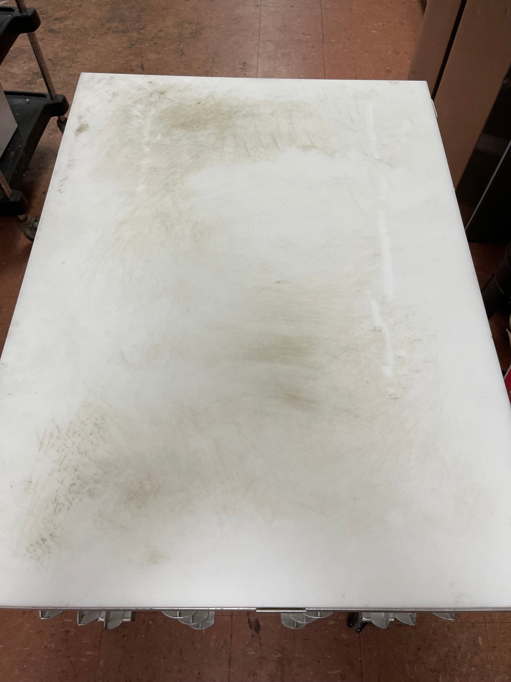 This rack is used but is in good usable condition. There are some scuffs and scratches from use. This is a very nice can rack on caster wheels with a poly top, The dimensions are 34.5"x25"x32.75",