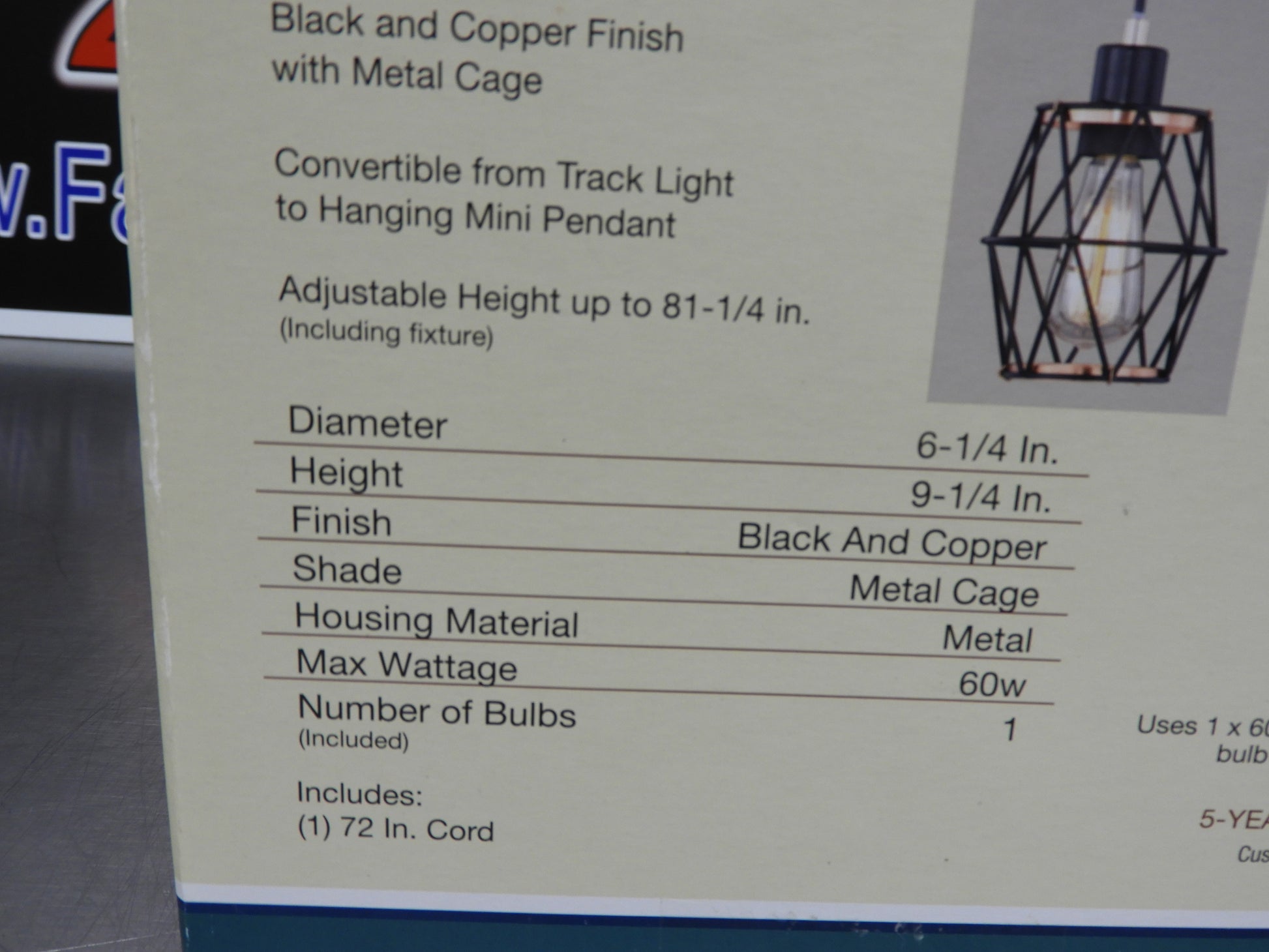 This is a new light still sealed in its original packaging. This is a nice looking light. It is black and copper with a metal cage. This height is adjustable and it can be track mounted or Ceiling mounted.