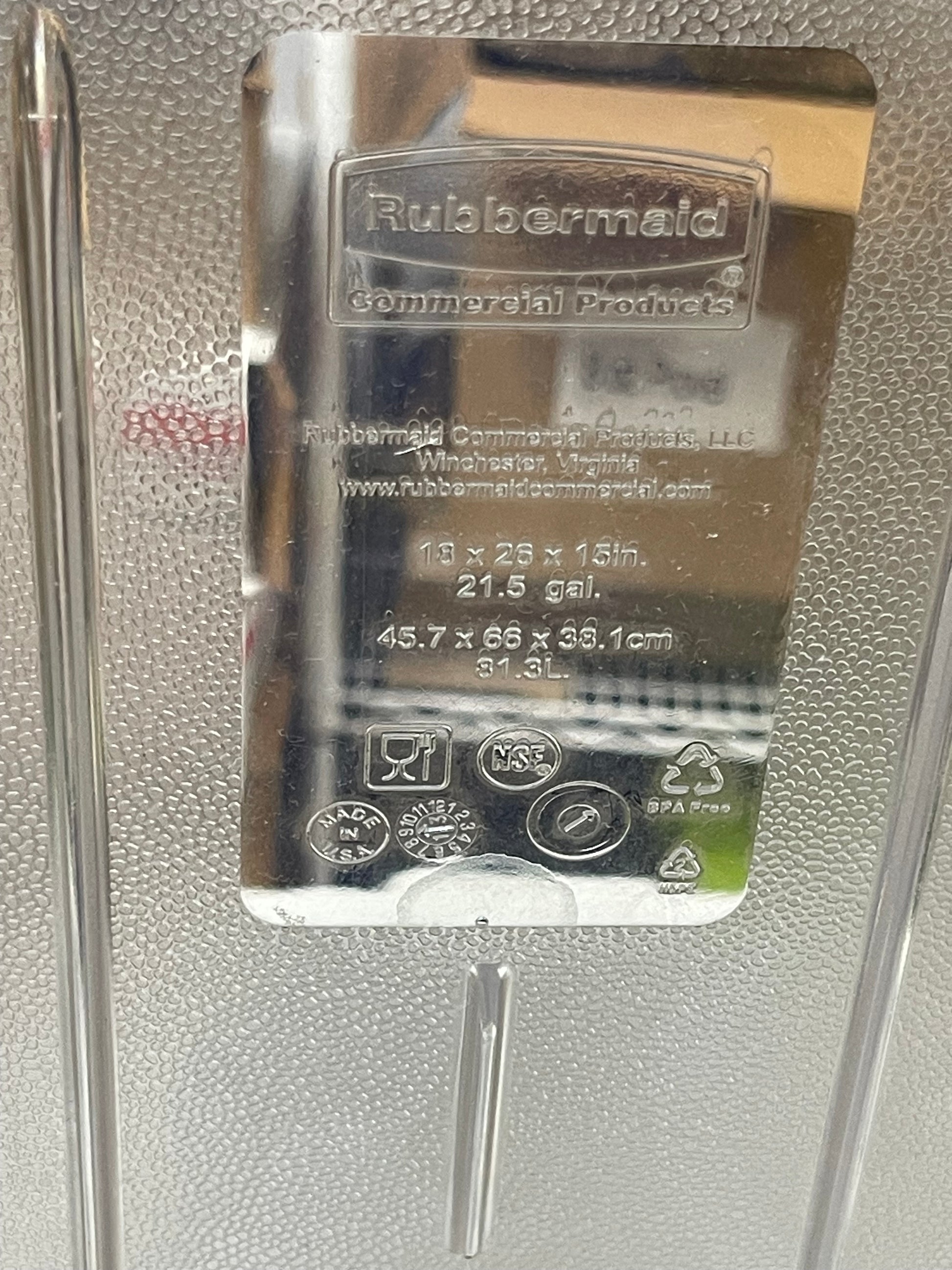 This is a new Rubbermaid food storage container. The dimensions are 26"x18"x15". Due to the size this will be pick up only at our location.