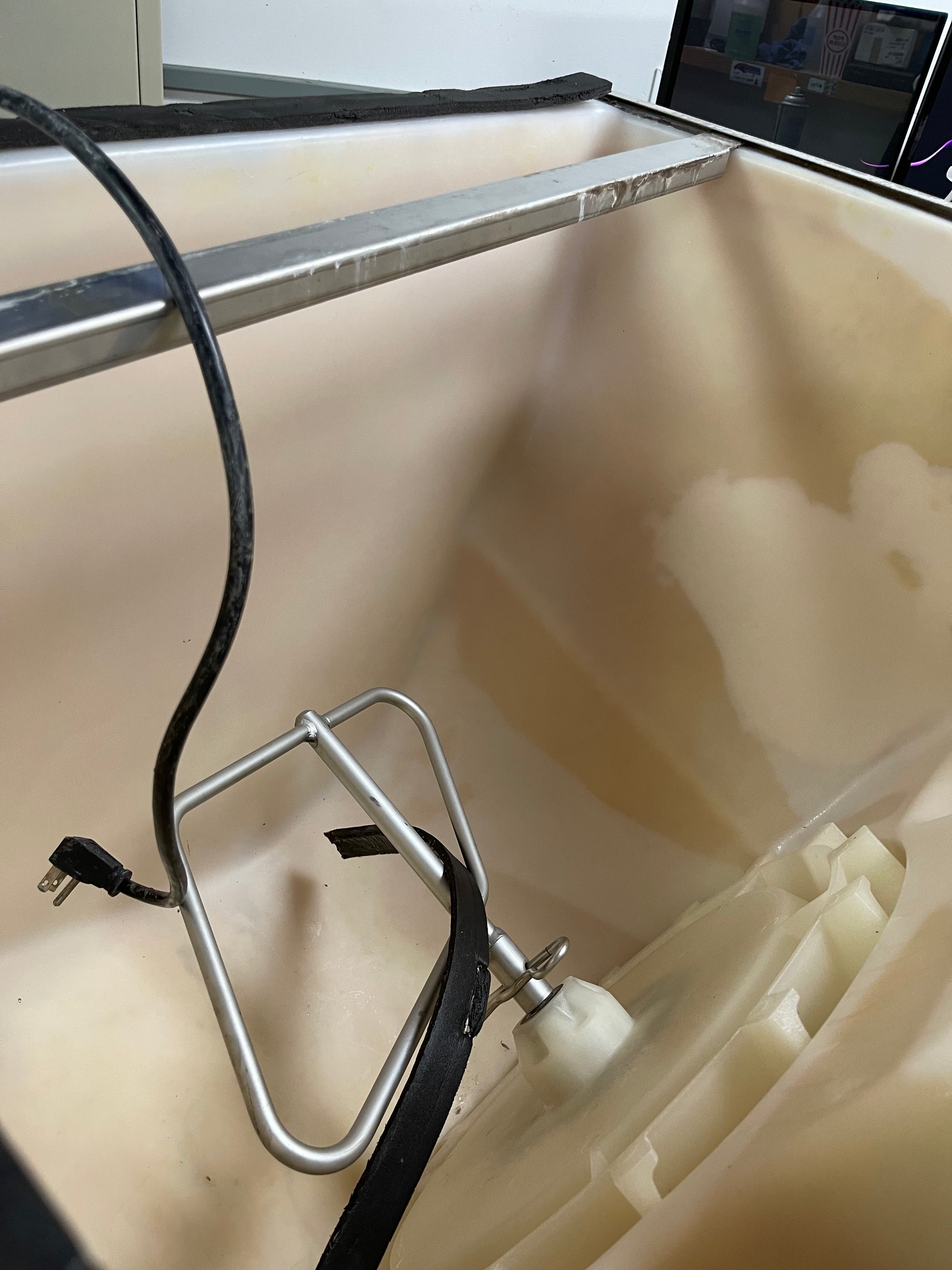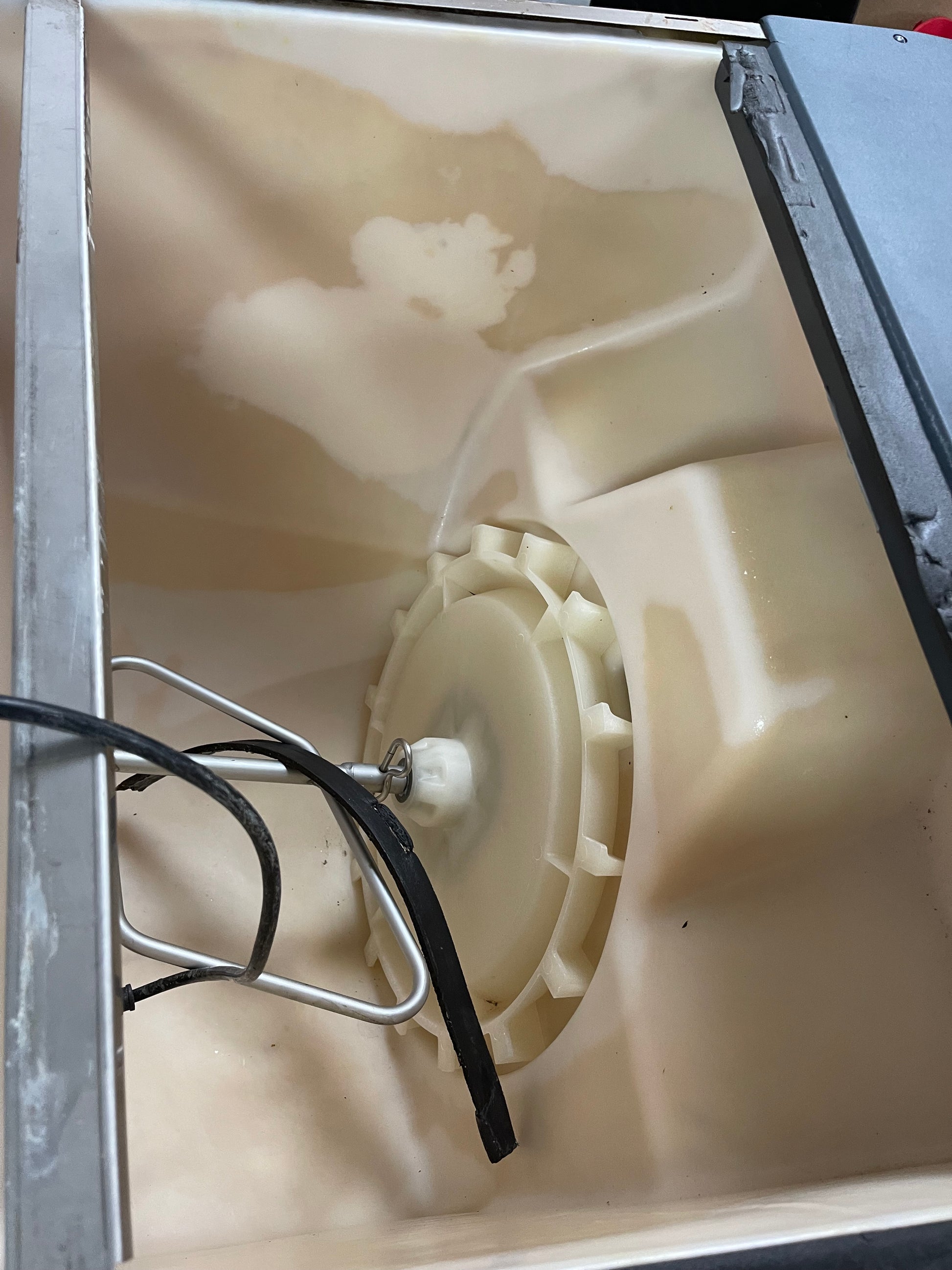 This ice dispenser is used but has been cleaned and tested. There are some scuffs and scratches on it from use. There is not a top on this machine. It is set up to have an ice maker sit on top of the bin (not included).