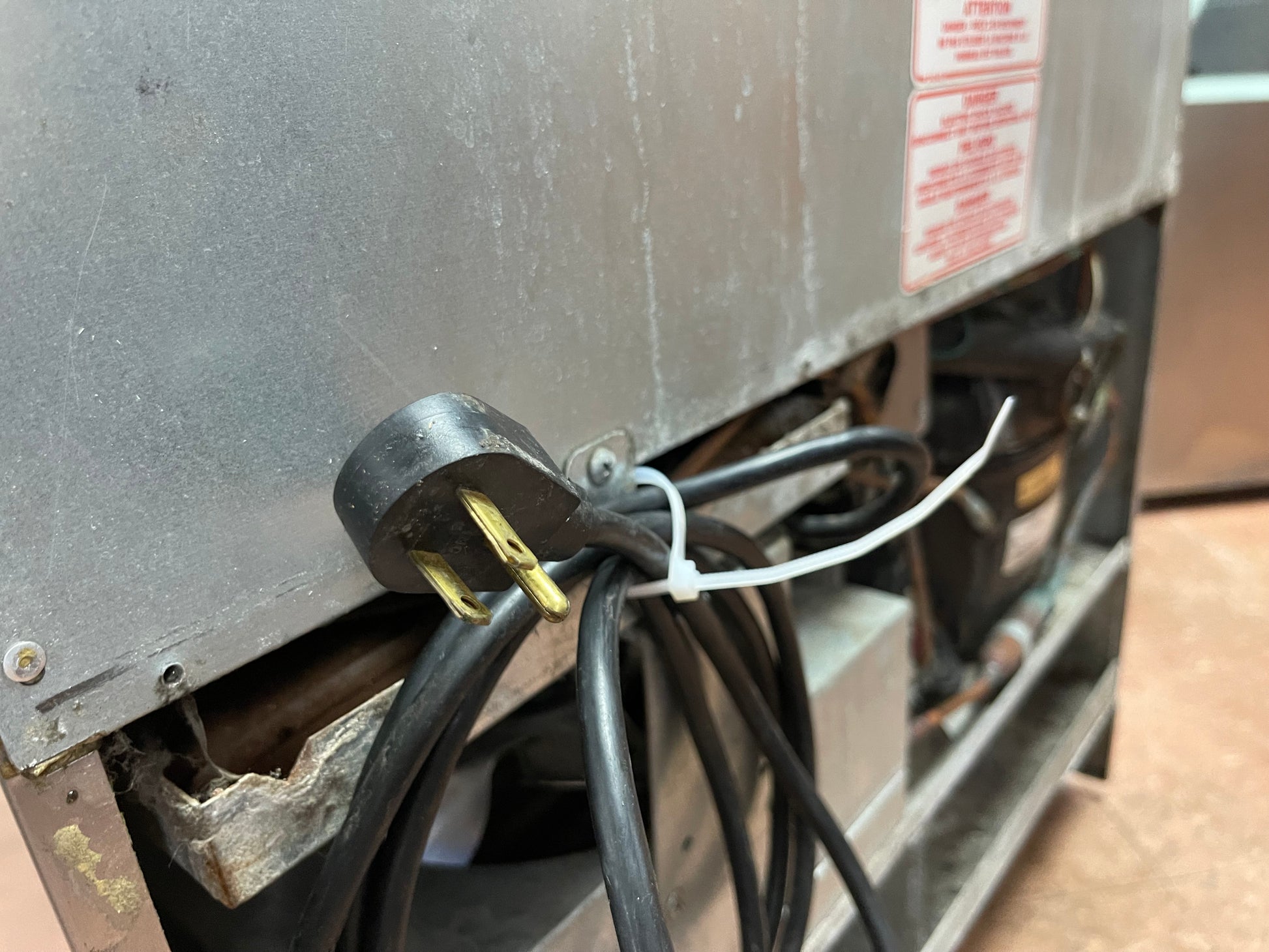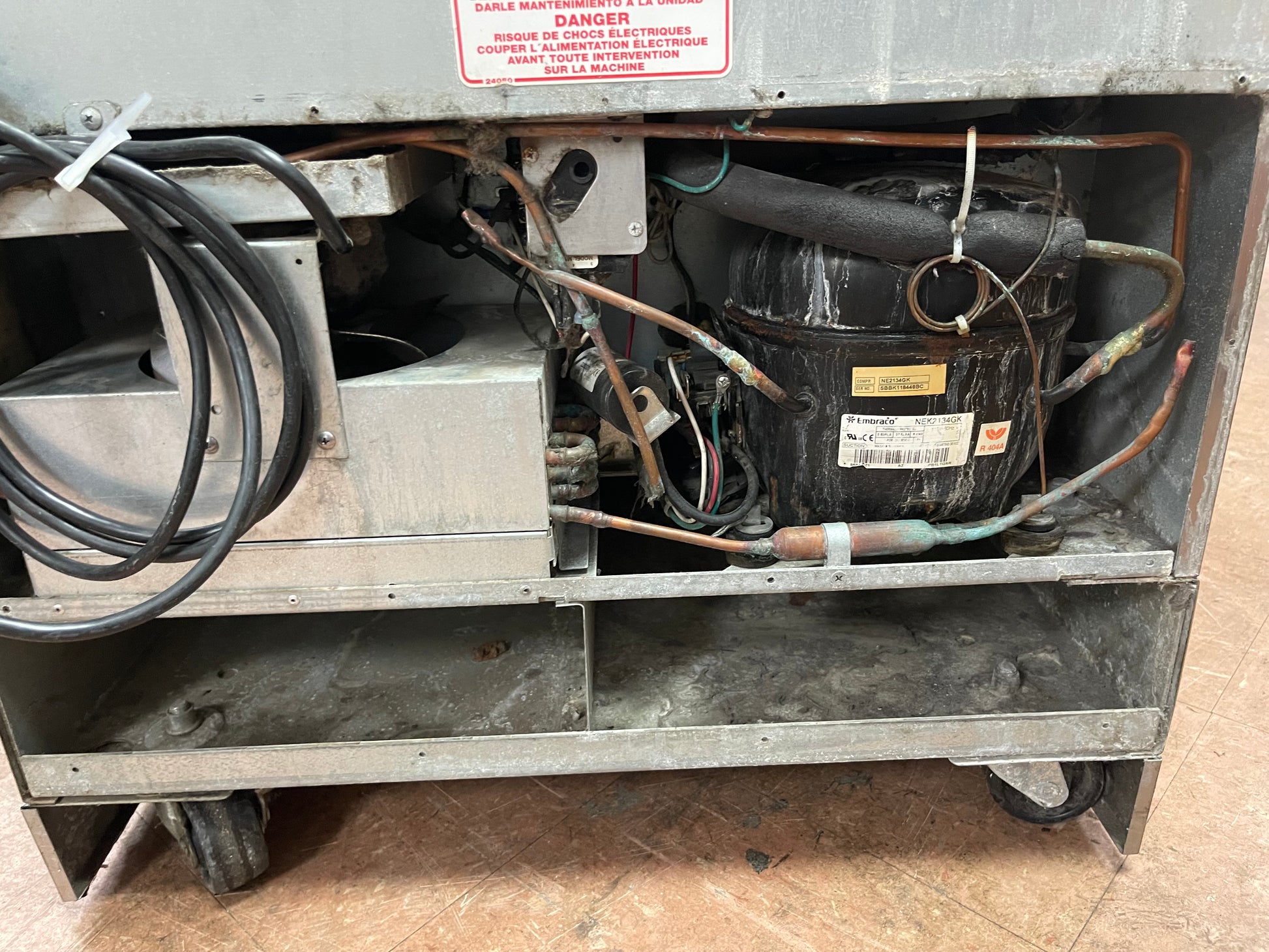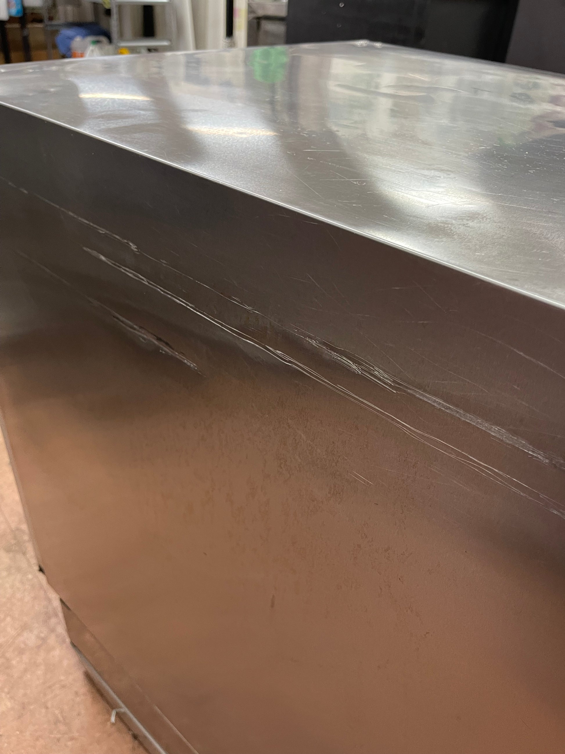 This freezer is used but has been cleaned and tested. There are some scuffs and scratches from use. This is a nice glass door freezer with dividers. The dimensions are 37"x29"x27".