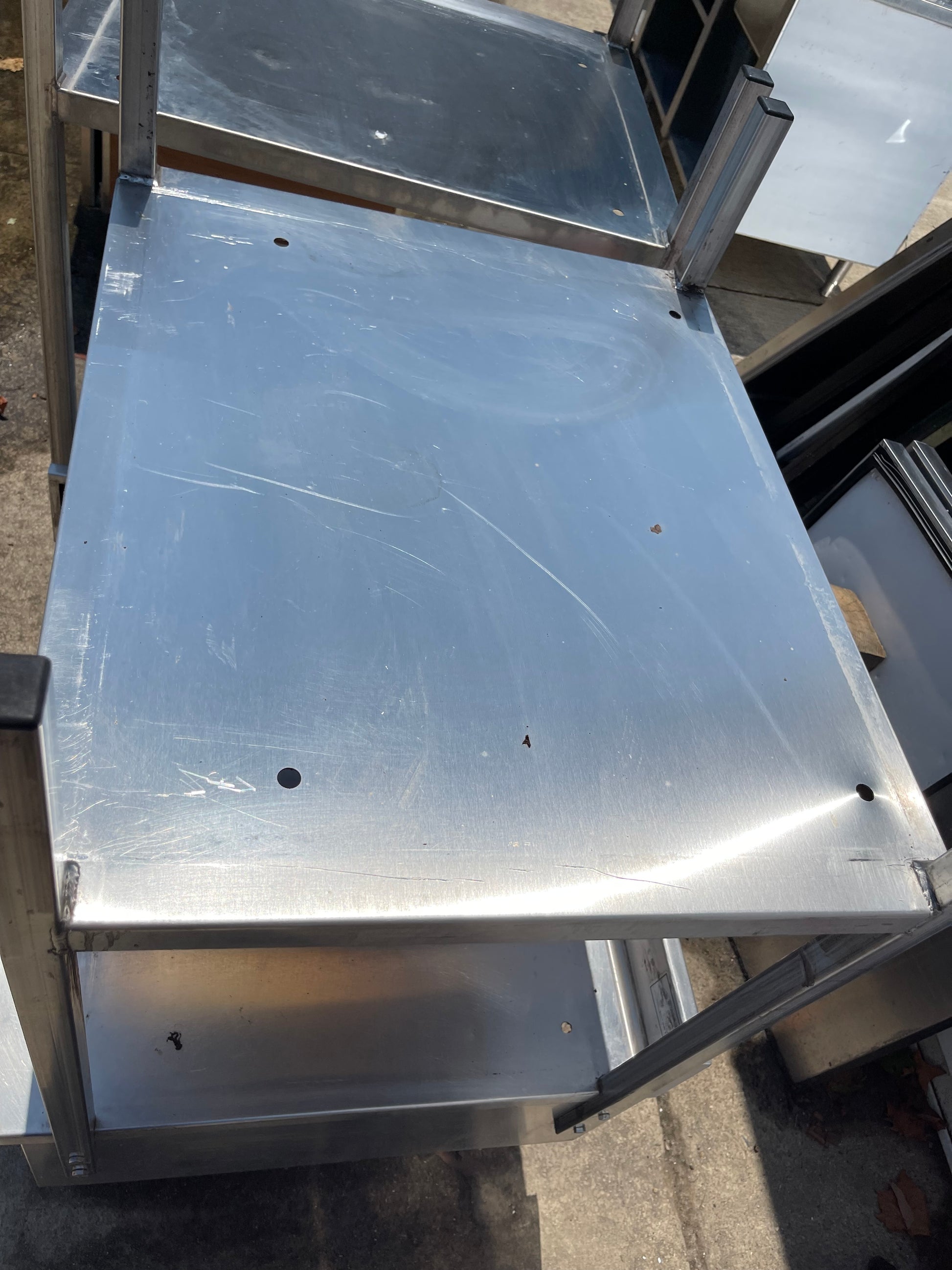 This stand is used but is in great condition. There are some scuffs and scratches on it from use. This is a very nice cart for stacking steam ovens, accelerated ovens or any other commercial equipment, This moves around very easily and saves space in your kitchen. The dimensions are 29"x28"x18.5" for the bottom shelf and 29"x24"x41" for the top shelf. The total height is 48.5". The shelves have predrilled holes for mounting the equipment. There is also a storage shelf under the bottom tier. This would be a great addition to your business.
