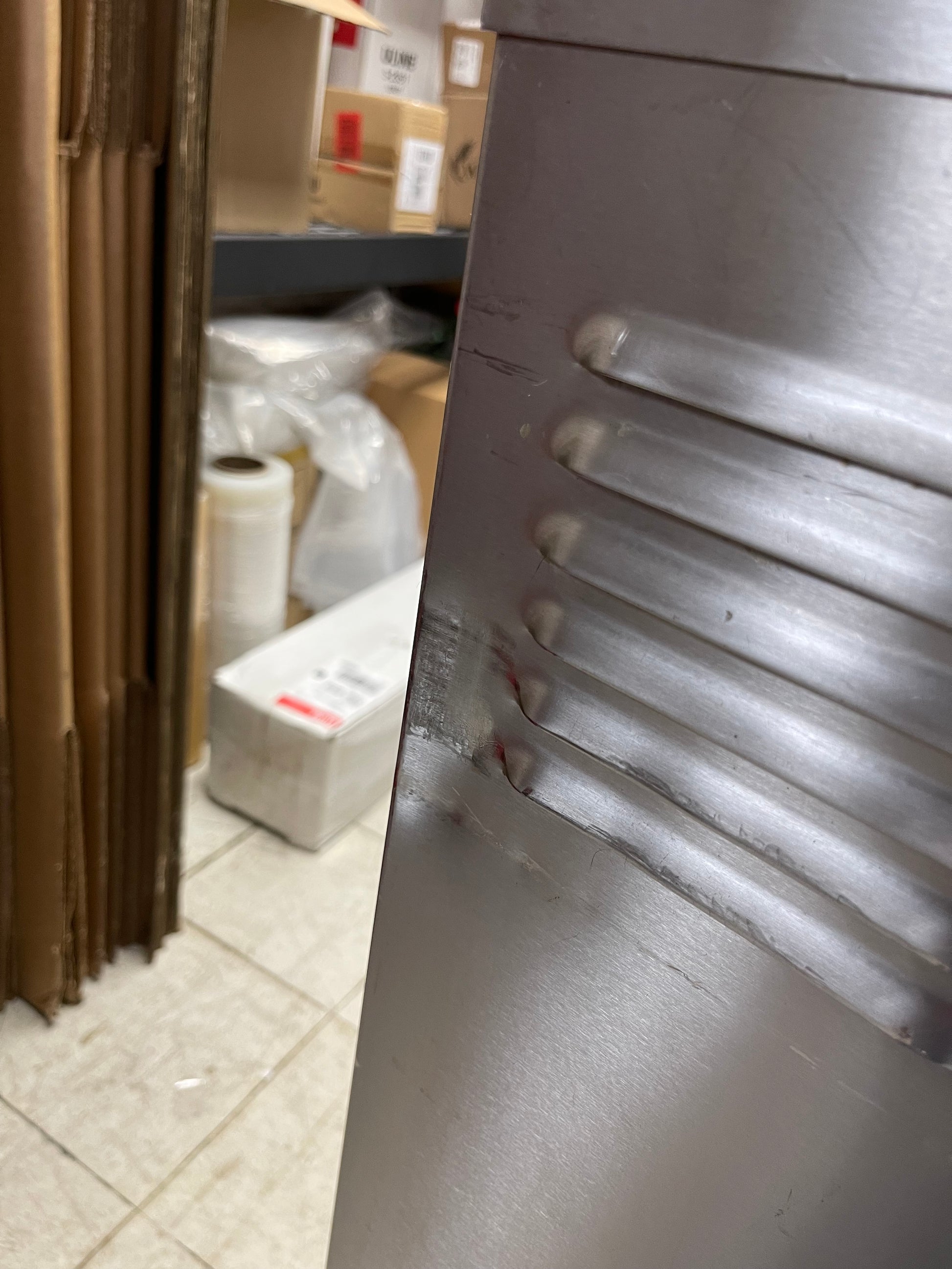 This plate warmer is used but has been cleaned and tested. There are some scuffs and scratches on it from use, There are also a few small dents. This has caster wheels and is very easy to move around. The dimensions are 23.5"W x 37"D x 44.5"H and weighs 300lbs.