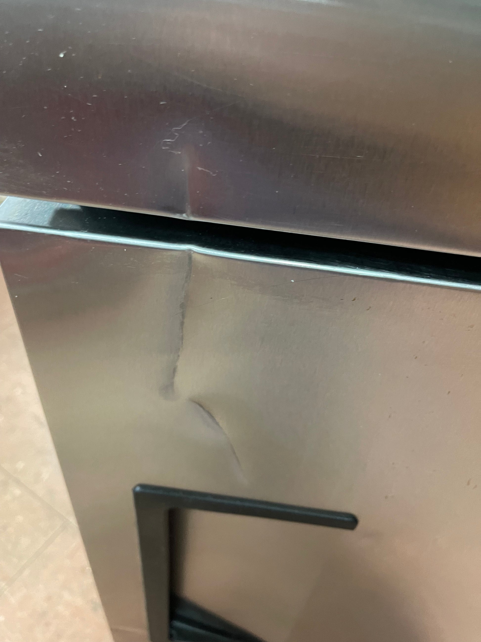 This refrigerator/freezer is used but has been cleaned and tested. There are some scuffs and scratches on it from normal use.