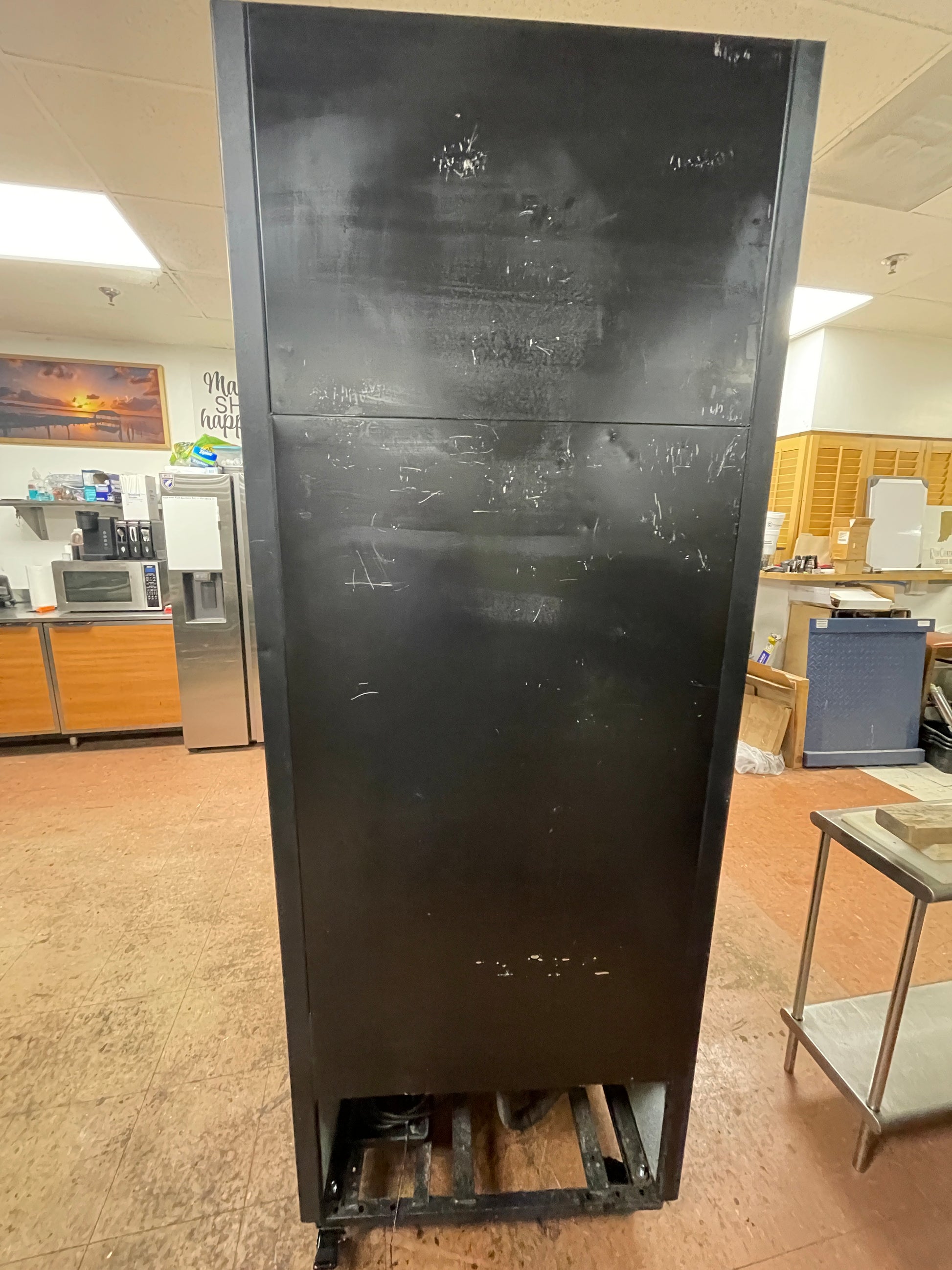 This merchandiser is used but has been cleaned and tested. There are some scuffs and scratches form use. Part of the handle has been broken off but it is still useable. Caster wheels shown are not included but can be purchased for an extra $100.