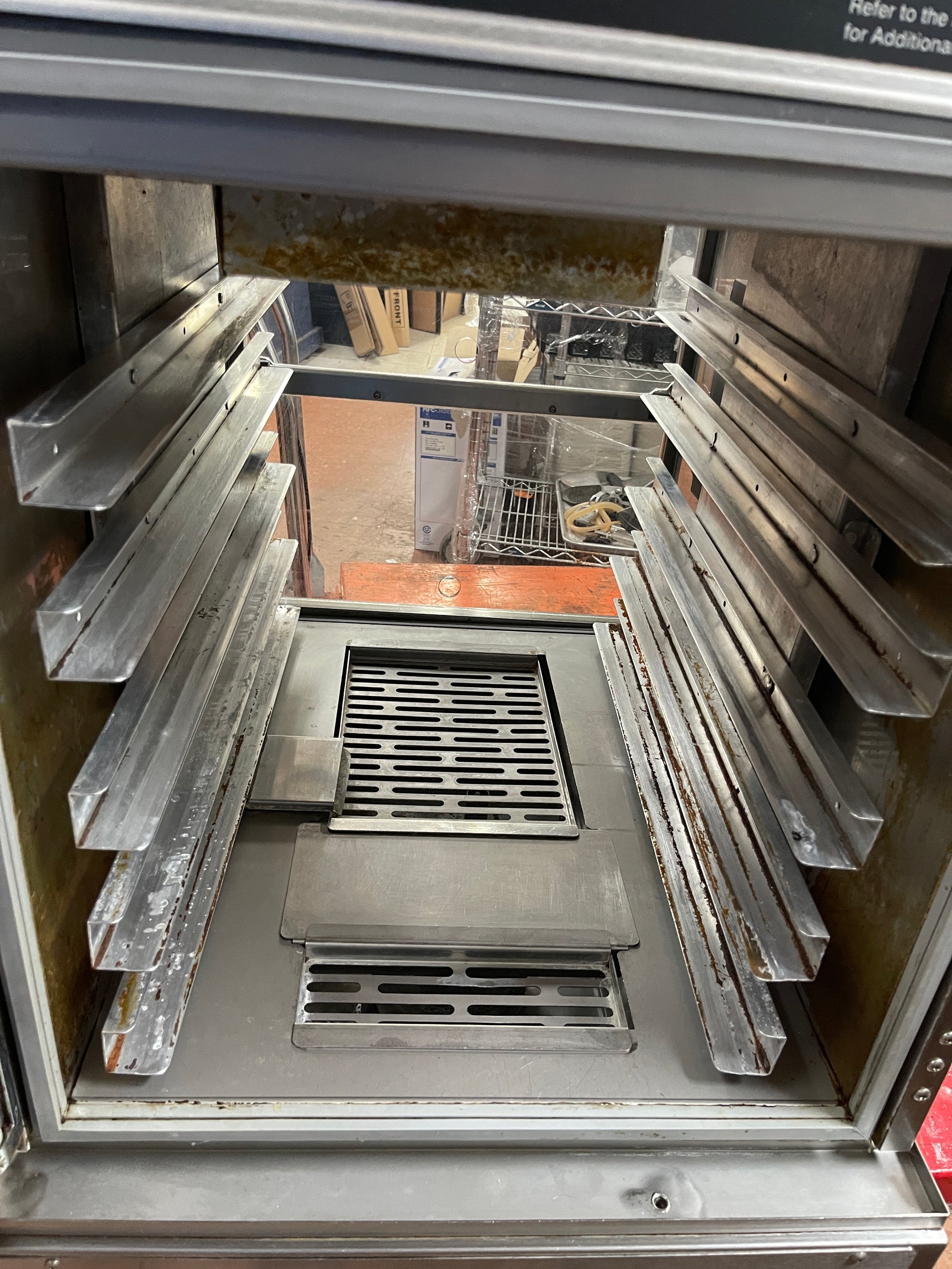 This SmartHOLD Holding cabinet is used but has been cleaned and tested. There are some minor scuffs and scratches from use. This has the flip door assembly on the front and back doors. The dimensions are 24.75"W x 31.75"D x 38"H. This has a 3 gallon water capacity.