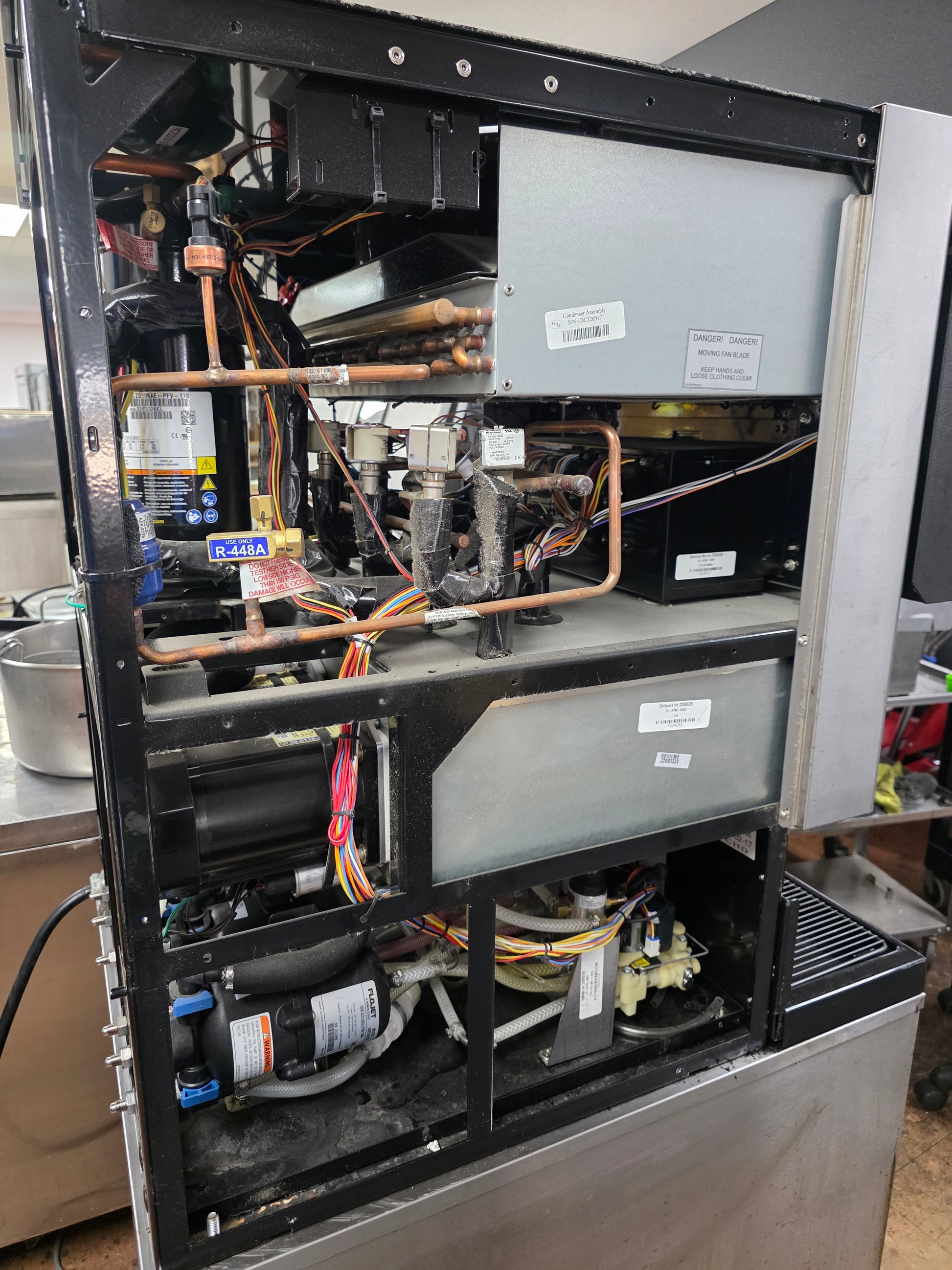 This machine is used but has been cleaned and inspected, There are some scuffs and scratches from use. We are selling this machine As Is because of not being able to test it. It was working when removed. This machine appears to be in very good condition. The dimensions are 26"W x 32.5"D x 75.5"H. This is self contained and does not require an external condenser.
