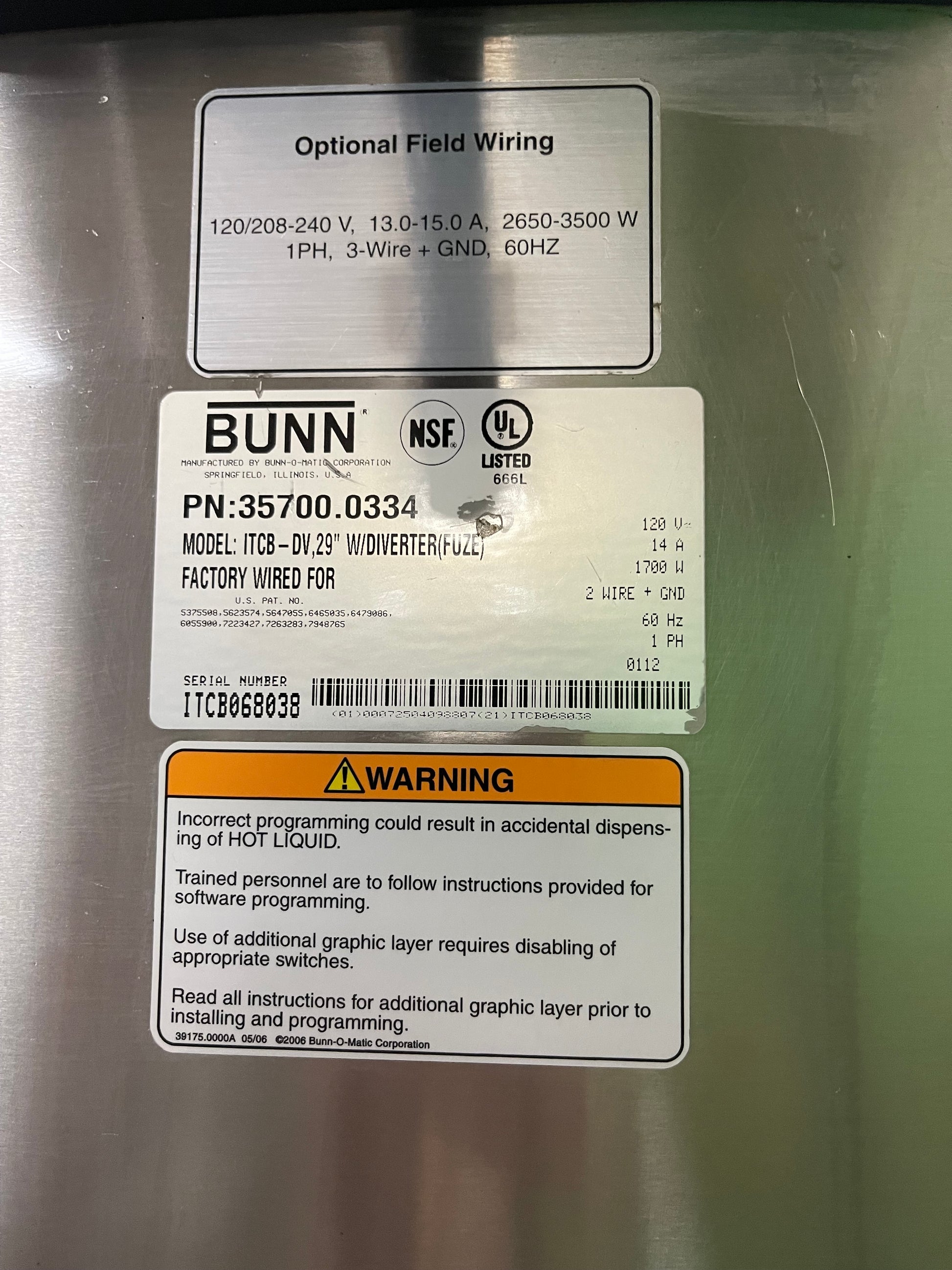 Product Specifications •Bunn-o-Matic 35700.0334 Specifications •Bunn Model: ITCB-DV •Product : 35700.0001 •Volts: 120, 208, 240 •Amps: 14, 13, 15 •Tank Heater Watts: 1680, 2611, 3476 •Total Watts: 1700, 2650, 3500 •Tea Brewing Capacity: 26.7 gal./hr. •*Cord Attached: Yes •Dimensions: 34.04" H x 10.12" W x 23.22" D • Power cord is rated for 120V, 15 amp use only.