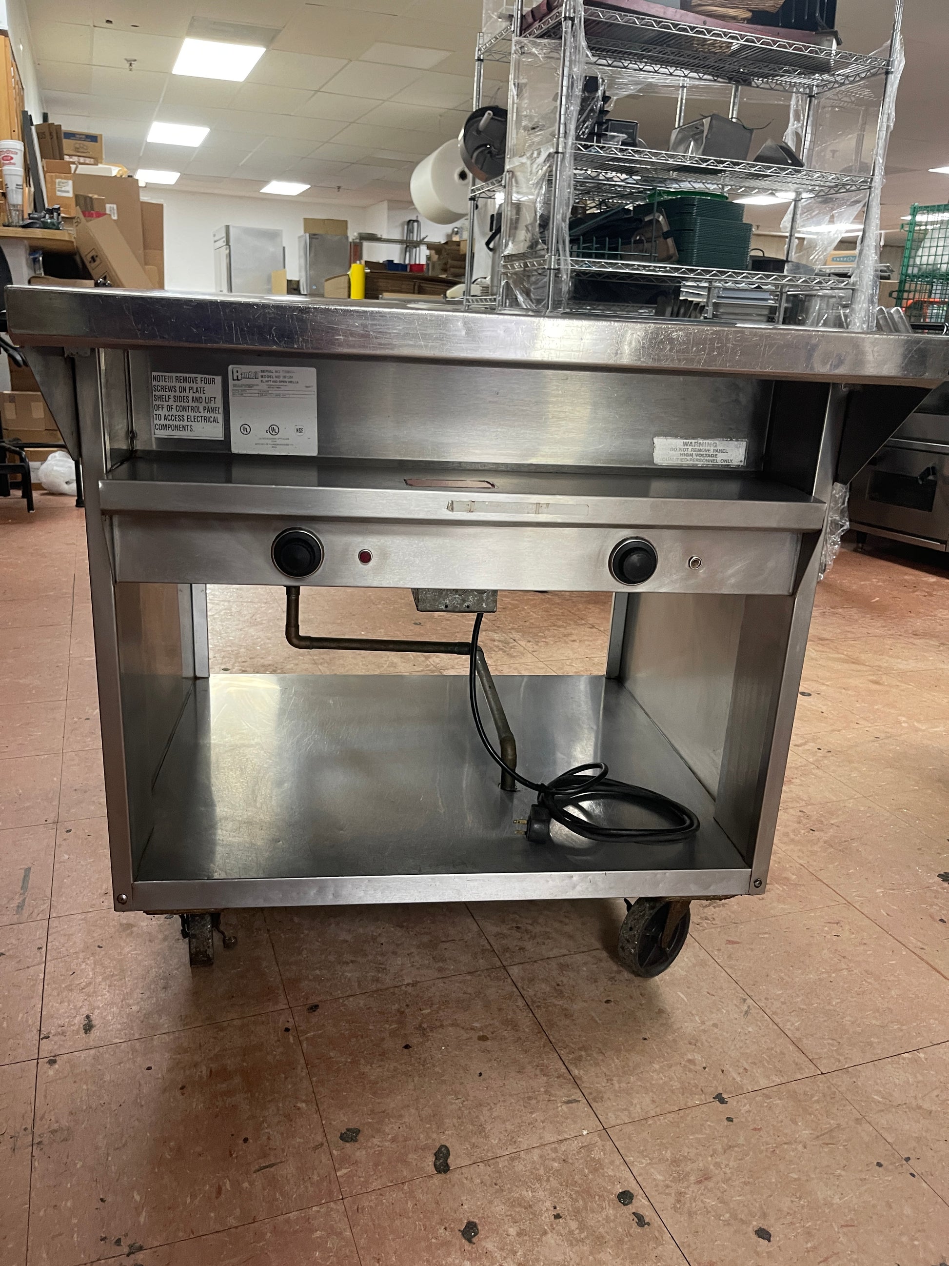 Randell, 3612M Hot Food Table, electric, 208/240V, 33" L, 30" D, 36" H, individual die-stamped (2) 12" x 20" top openings, sealed well with bottom element (used for wet operation), individual thermostatically controlled, stationary modular, open shelf base, stainless steel top & ends.