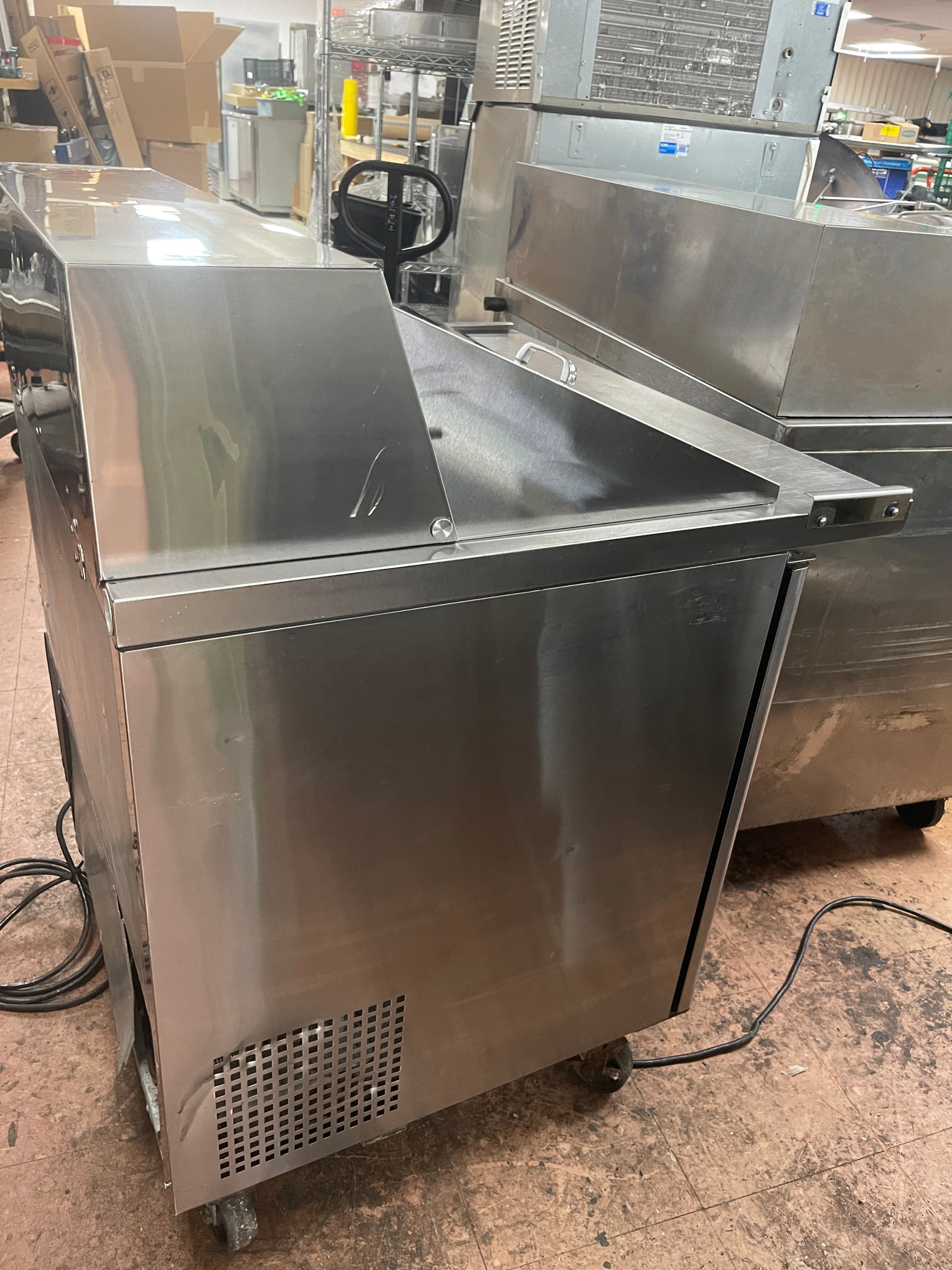 This prep table is used but has been cleaned and tested. There are some scratches and dents on it from use.