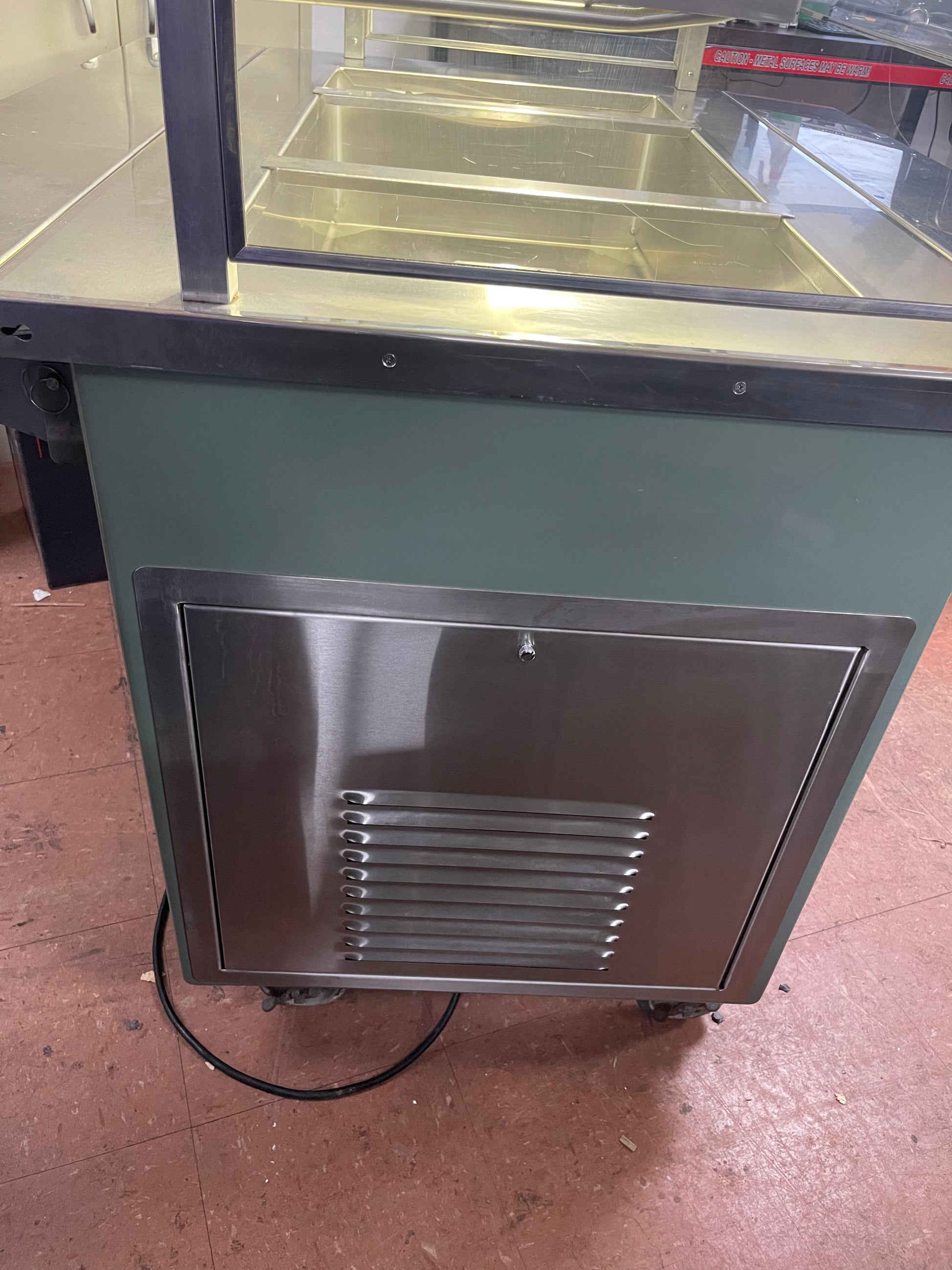 SpecLine TempestAir Cold Serving Counter, 50-3/8"W x 30"D x 36"H, 14ga stainless steel top with (1) 38"W x 20"D x 9" deep stainless steel cold well, accommodates (3) full size 6" deep food pans, forced air refrigeration with (1) fan, Side storage area, and 5" caster wheels. 120V