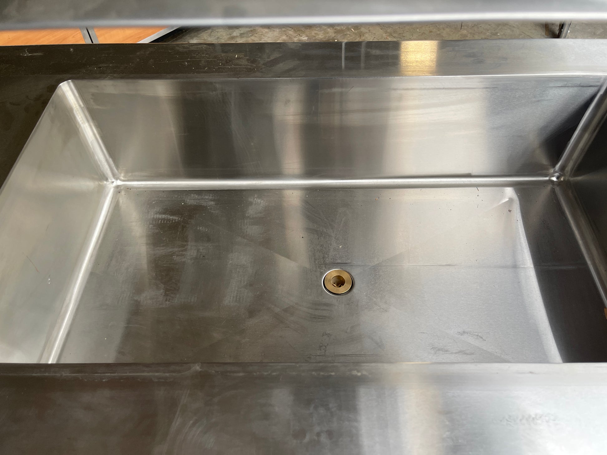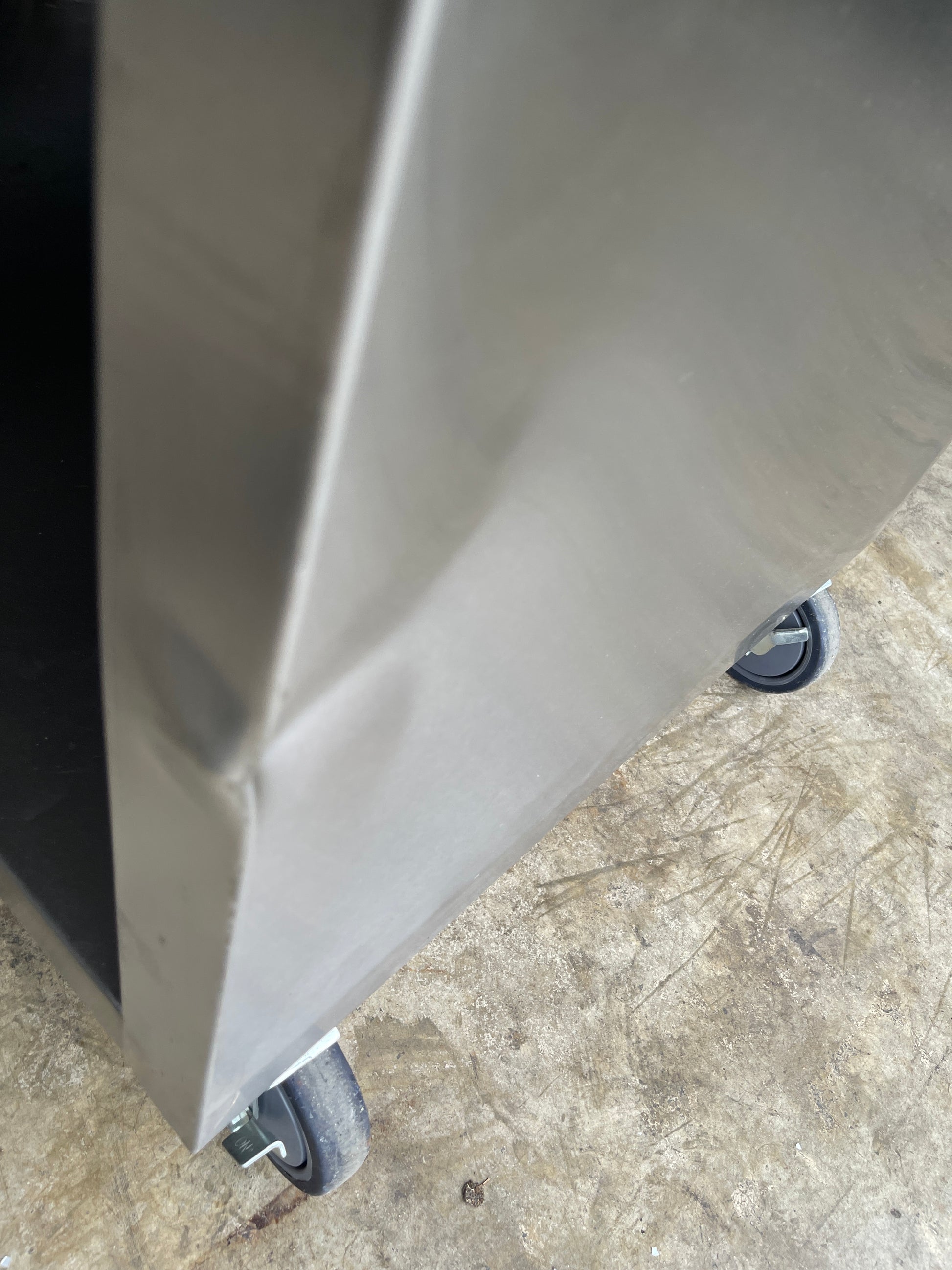 This cart is used and does have some scratches and dents on it from use. This has wheels and easily moves around The dimensions are 52"W x 29.75"D x 34"H to the work surface. The compartment is 37.5"W x 19.75"L x 10"D. This will hold 3 full size pans (not included), there is also a drain in the compartment.