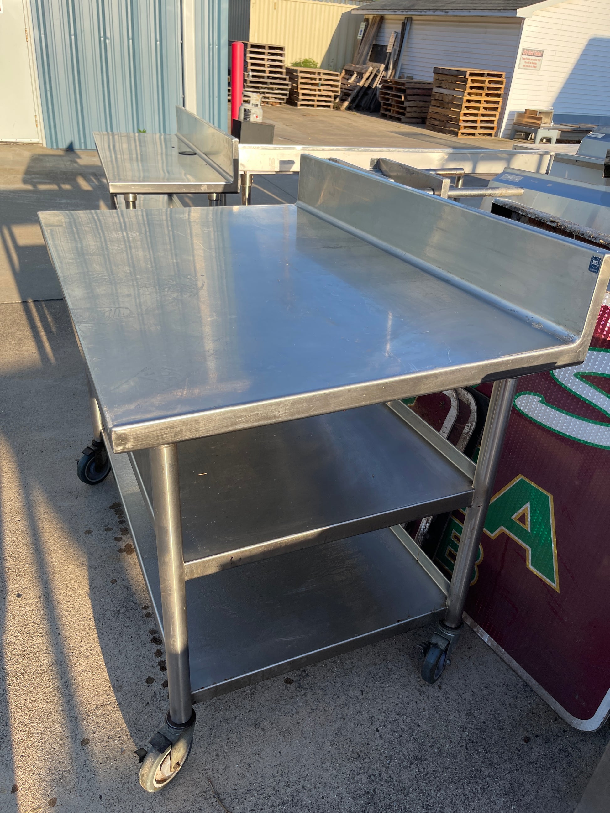 Used 48"x32" Heavy Stainless Table with Shelves, Casters and 6" Backsplash JD - SS324