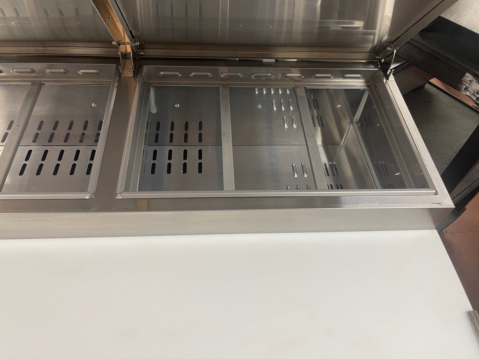 This prep table is used but has been cleaned and tested. There are some scratches and small dents from use. This was only used in a test kitchen so it was very lightly used.