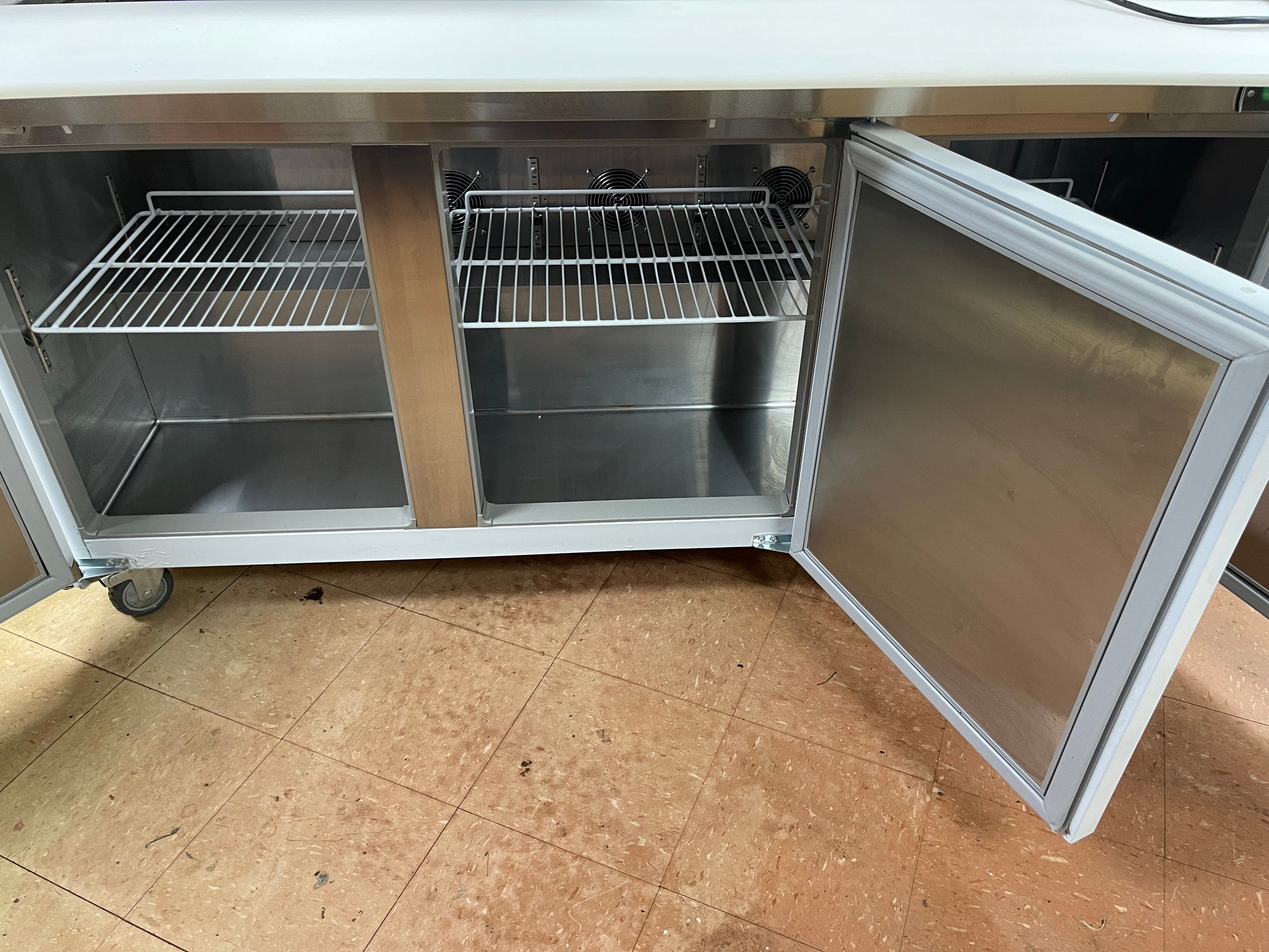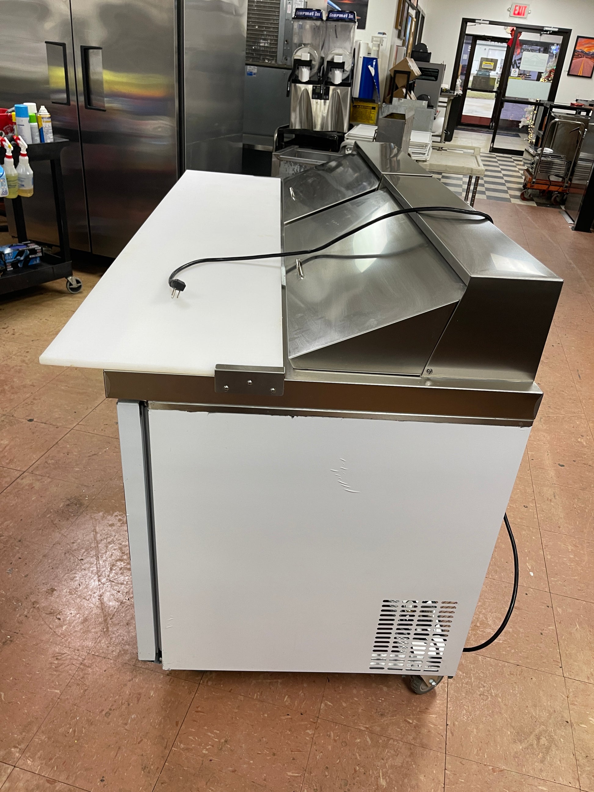 This prep table is used but has been cleaned and tested. There are some scratches from use, but the outside still has the protective film on it. We had to install a new controller so the heated defrost does not work, but it still has a defrost cycle just not heated. We are selling this As Is because the company does not sell repair parts. The dimensions are 72"W x 29.9"D x 42.8"H.