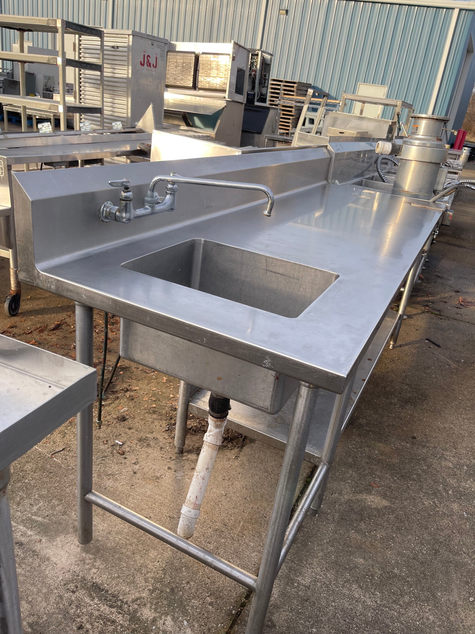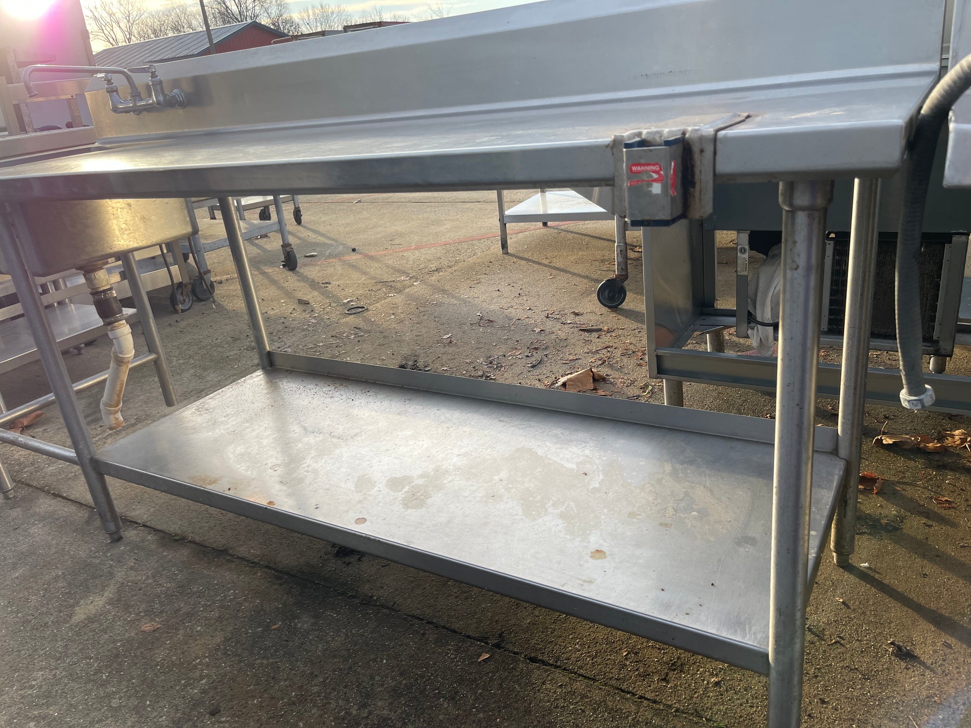 This table is used but is in good usable condition. The dimensions are 90"L x 30"D x 36"H with 8" backsplash. The sink compartment is 18"L x 15"W x 10'D.