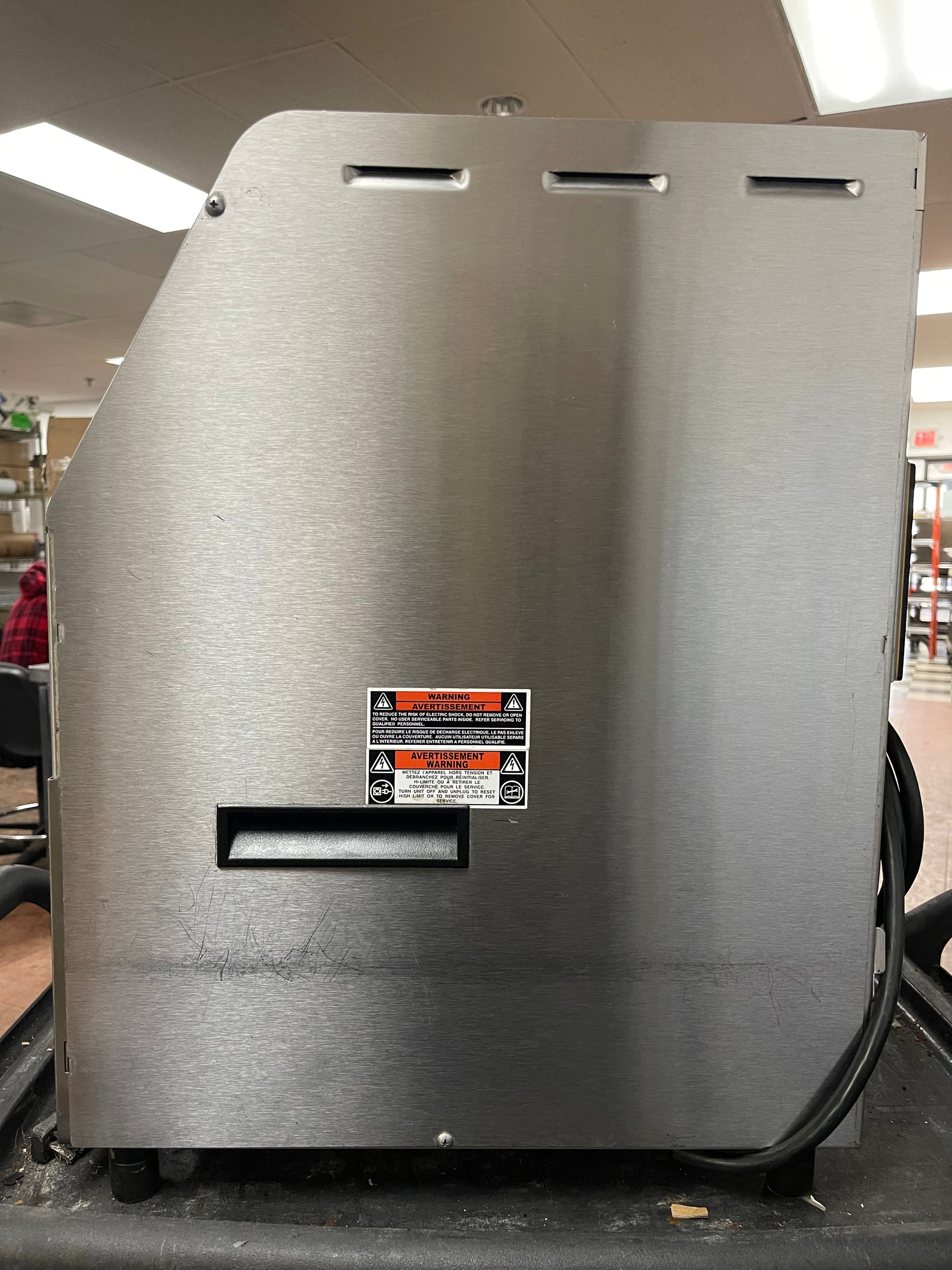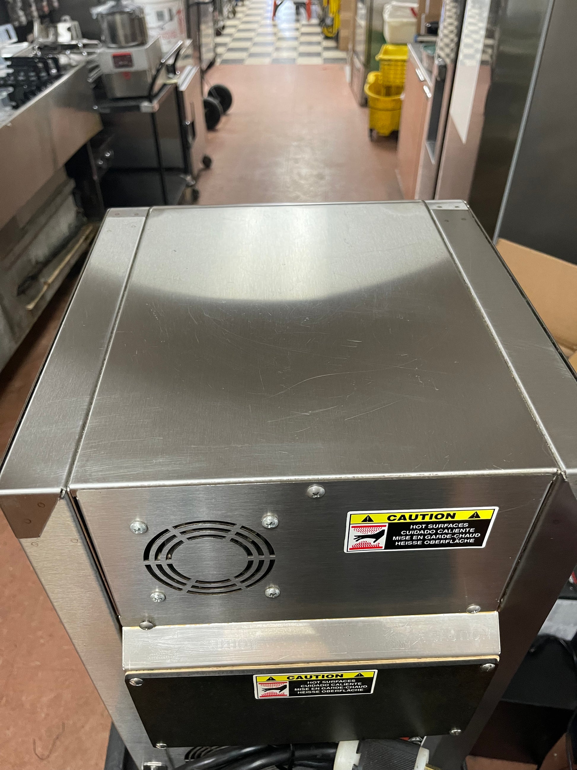 This toaster is used but has been cleaned and tested. There are some scuffs and scratches from use. It is missing a small shield that goes in front of the conveyor, but this does not affect the functioning of this toaster. This only toast on one side of the product.