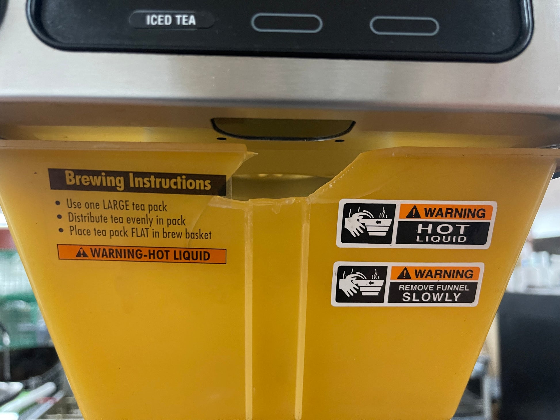 This brewer is used but has been cleaned and tested. There are some minor scuffs and scratches from use. The handle is broken off of the funnel.